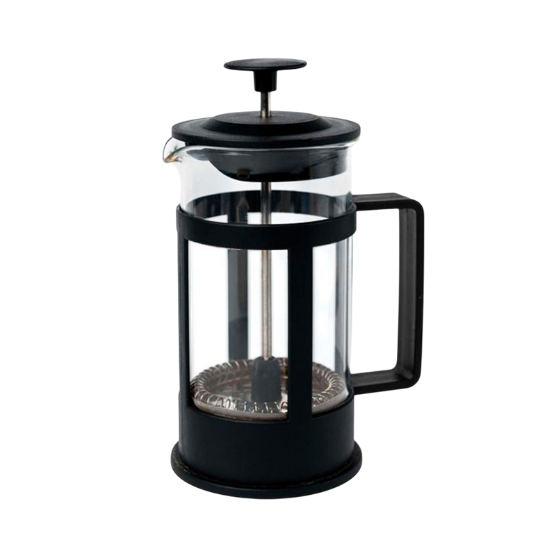 Prensa francesa de vidrio con borde y agarrador plastico color negro 350 ml.