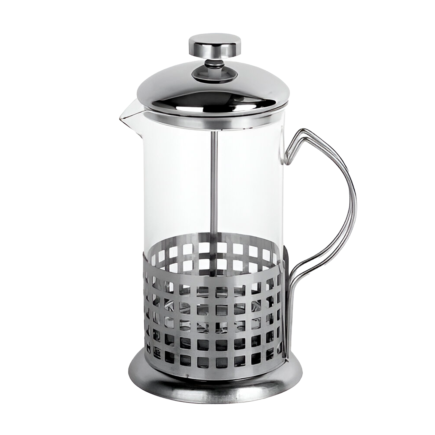 Prensa francesa de vidrio con borde y agarrador metal color plateado 350 ml.