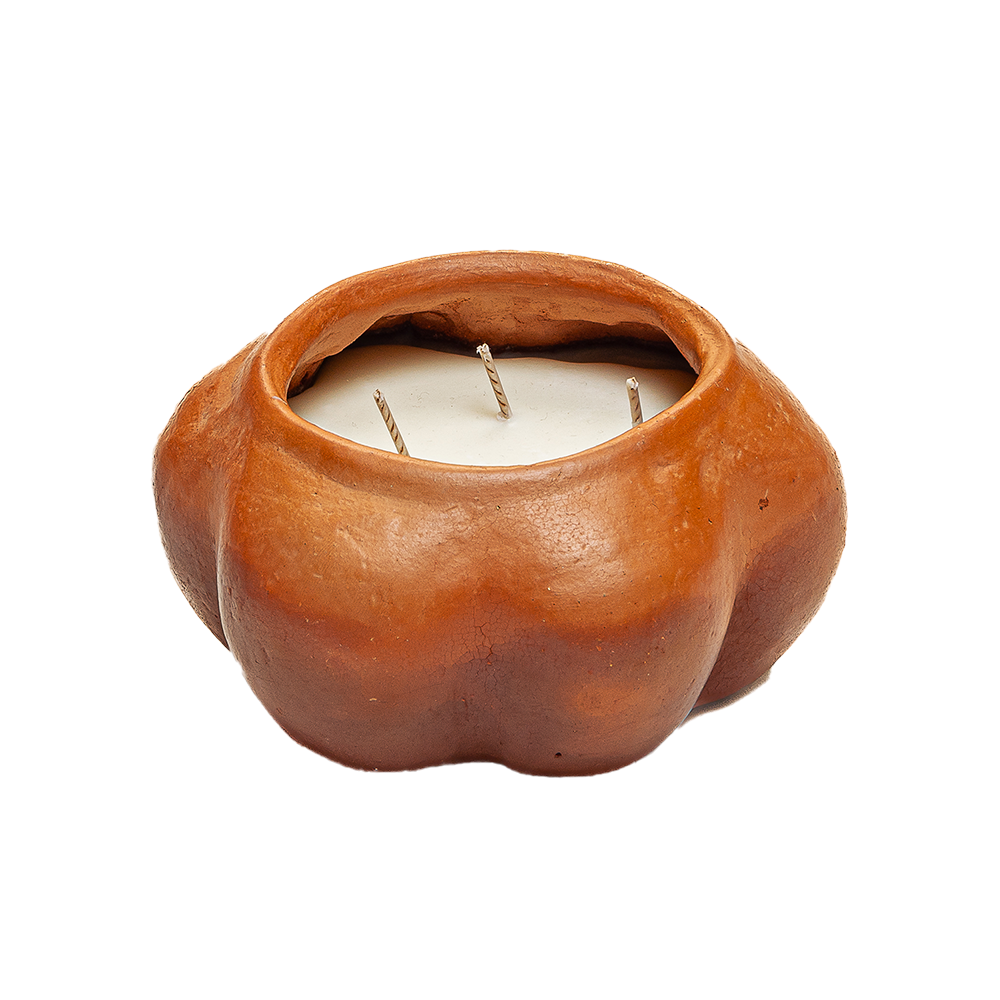 Vela de soya en recipiente artesanal de barro en forma de flor tamaño grande.