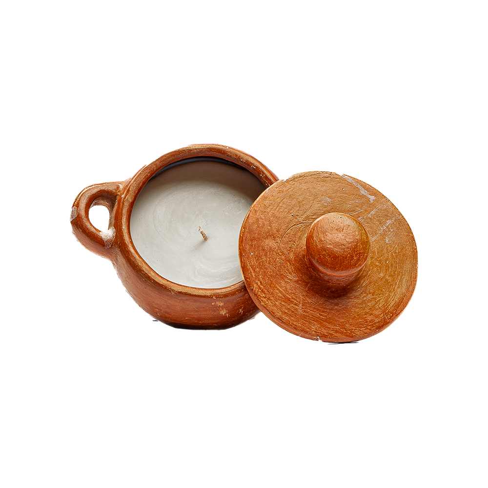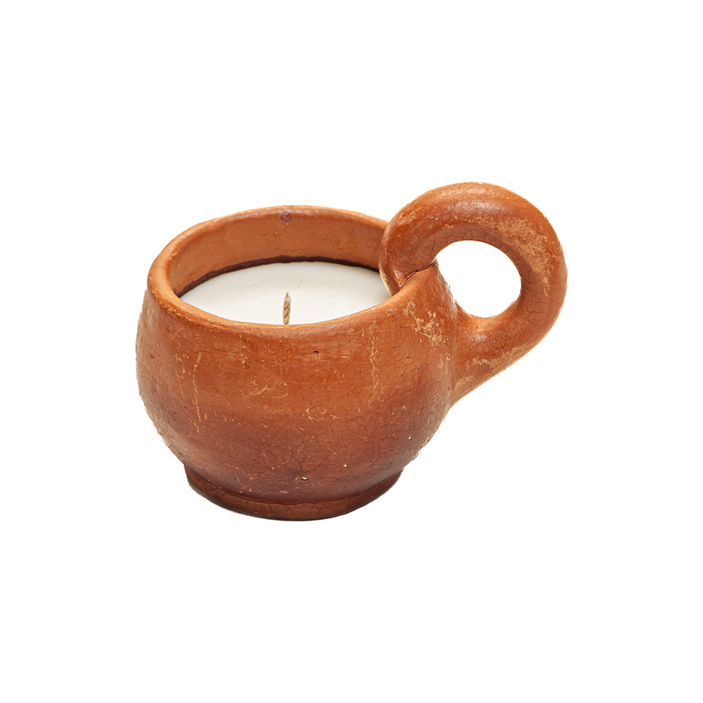 Vela de soya en recipiente artesanal de barro en forma redonda con sujetador a un costado tamaño mediano.