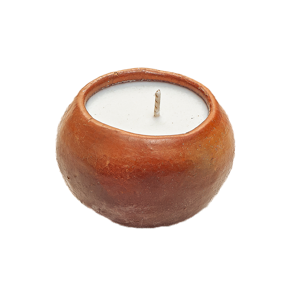 Vela de soya en recipiente artesanal de barro en forma redonda tamaño pequeño.