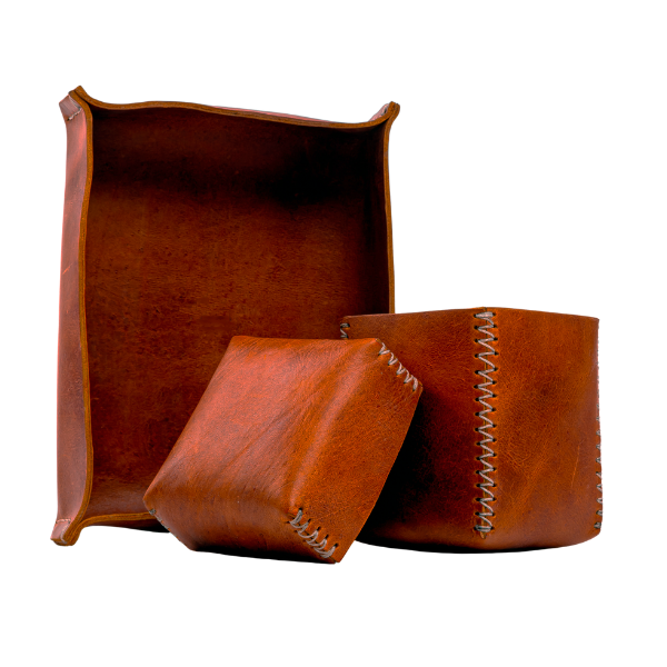 Set de 2 piezas para organizar escritorio de cuero cocido a mano. Incluye bandeja para reloj y/o llaves 22×17.5 cm y vaso para lapiceros con tapadera 10x10x10 cm.