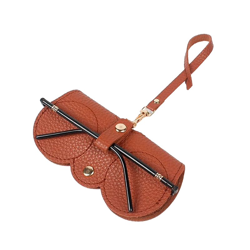 Estuche protector de lentes en cuero y accesorios para colgar en metal dorado.