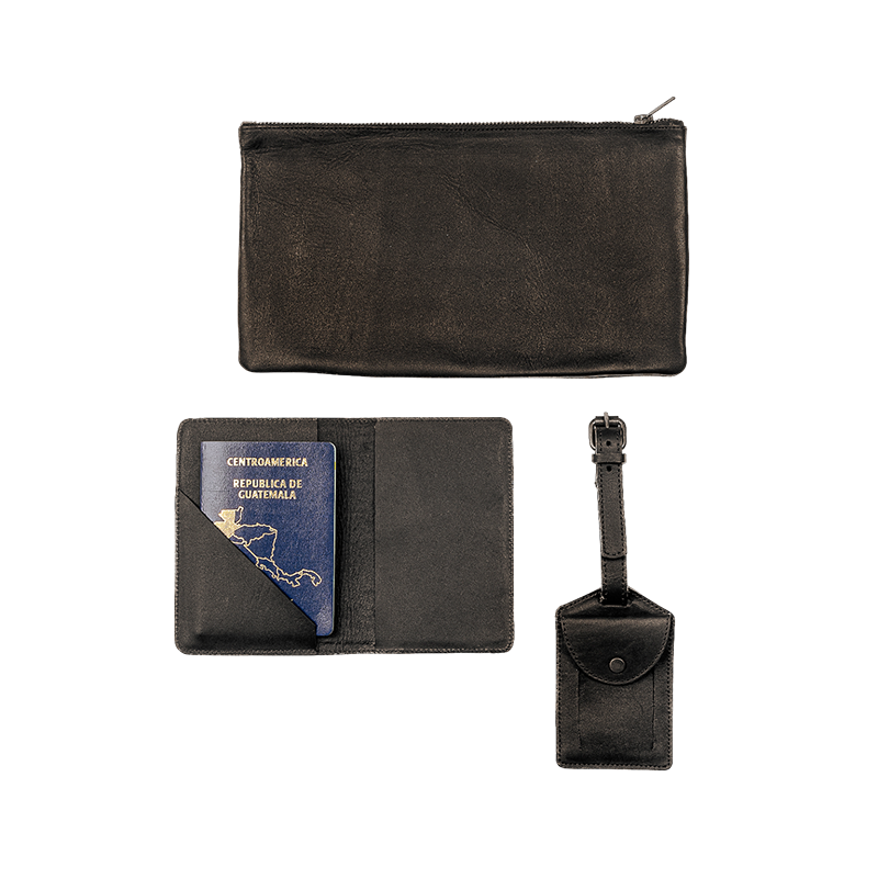 Kit de viaje en cuero que incluye: porta pasaporte de 11 x 16 cm, tag de maleta 7.5 x 13 cm y maletín porta documentos con zipper 29 x 18 cm.