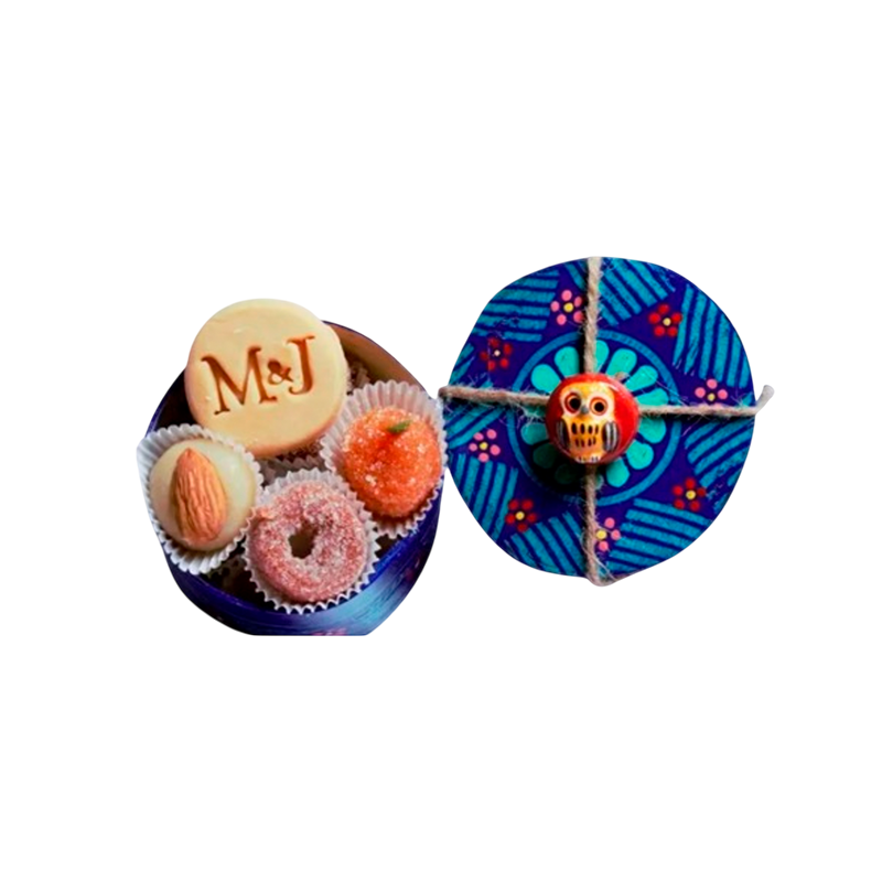 Caja pequeña con 5 dulces típicos variados hecha en madera y pintada a mano.