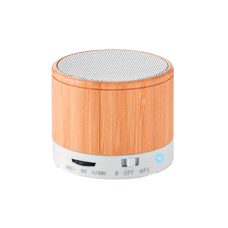 Bocina de bambú color natural con base blanca 6*6*5 cm.
