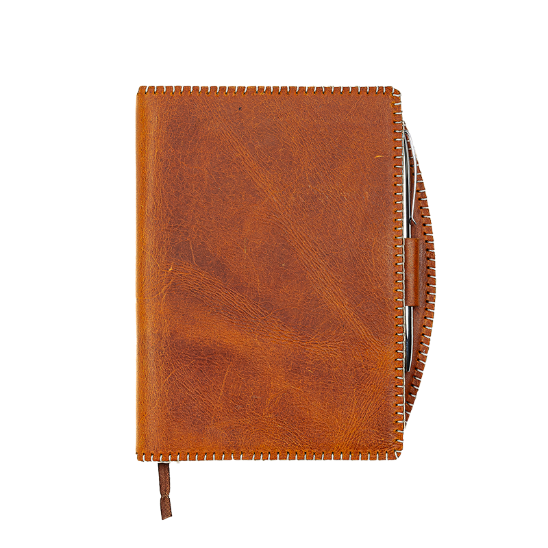 Porta agenda de cuero natural con orilla cocida a mano, incluye lapicero metálico plateado y cuaderno tipo agenda 16 x 23 cm.