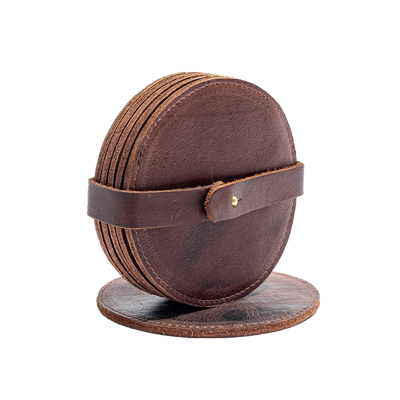 Set de 4 portavasos redondos de cuero con acabado fino, costura alrededor y cintillo de cuero con pin metálico con medida de 10 cm de diámetro.