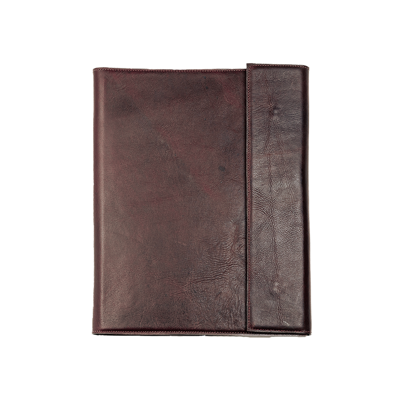 Portafolio grande de cuero con espacio para guardar laptop, incluye lapicero metálico plateado y bloc de notas 35 x 28.5 cm.