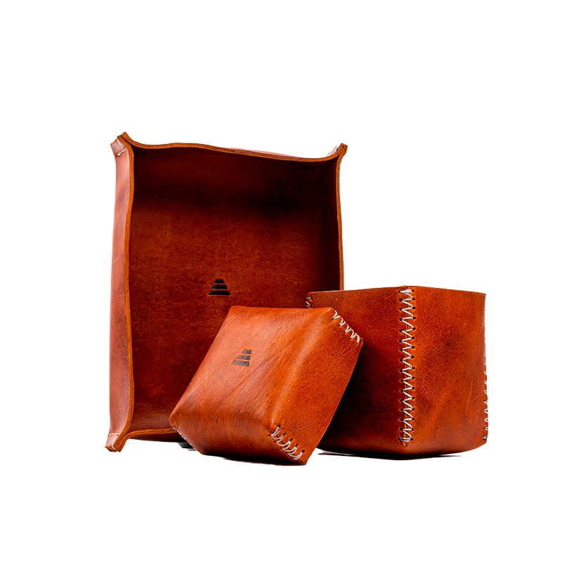 Set de 2 piezas para organizar escritorio de cuero cocido a mano. Incluye bandeja para reloj y/o llaves 22×17.5 cm y vaso para lapiceros con tapadera 10x10x10 cm.