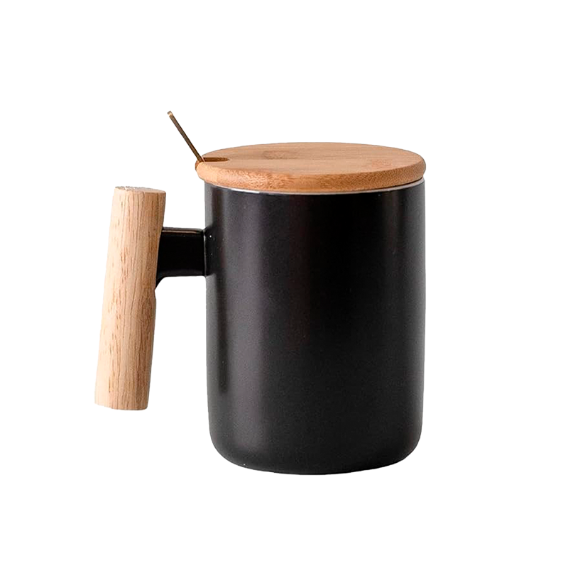 Taza cerámica blanca con oreja y tapa de bambú y cuchara 380 ml.