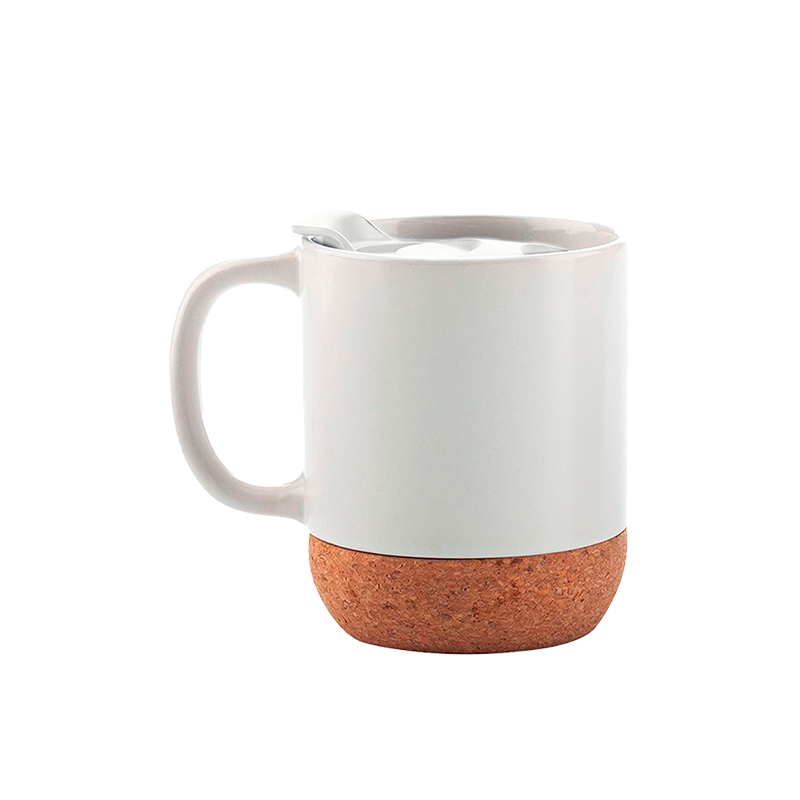 Taza de cerámica blanca con base de corcho y tapa plástica.