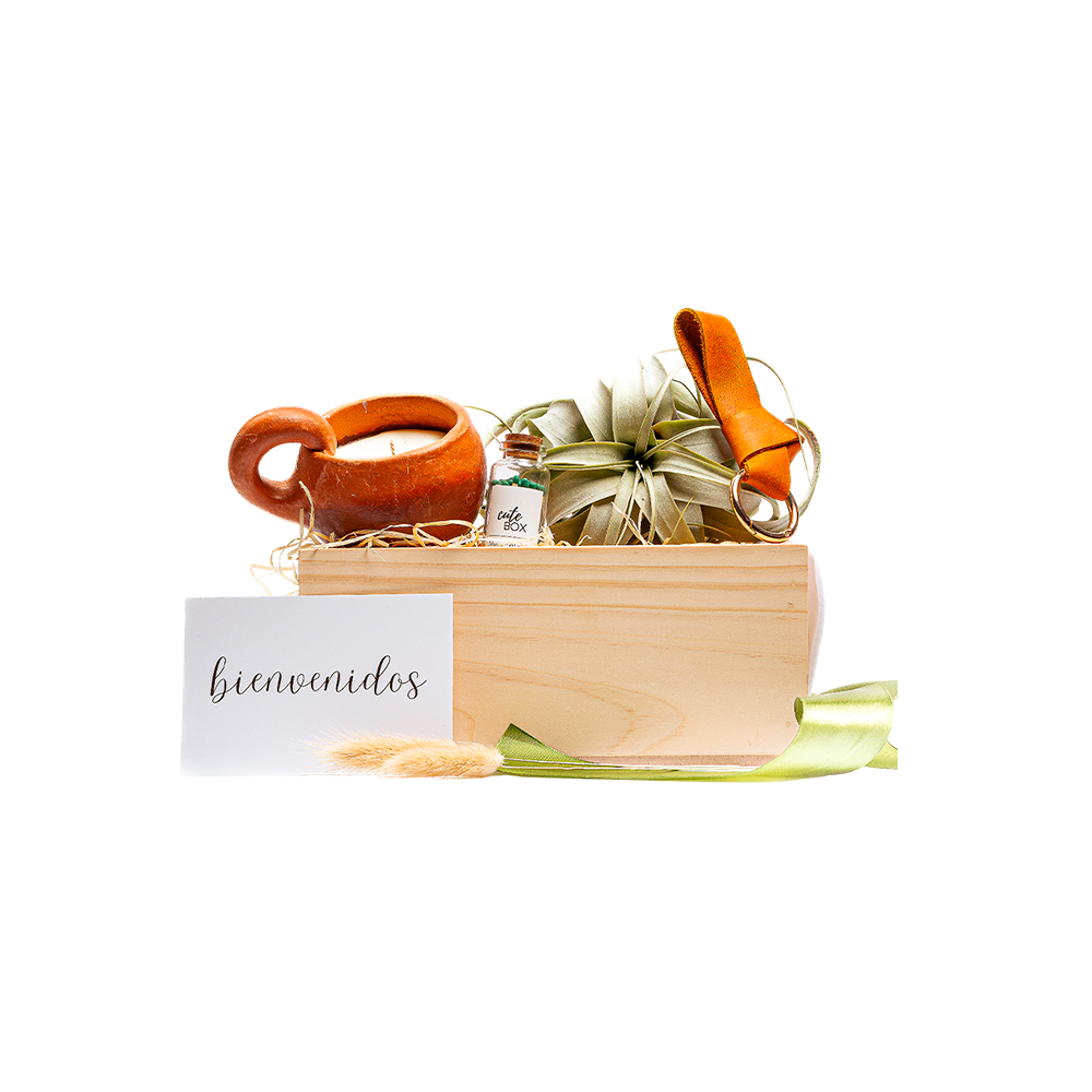 Empacado en caja de madera tipo cofre tamaño grande. Papel de relleno, listón, tarjetas personalizables y flor natural seca.