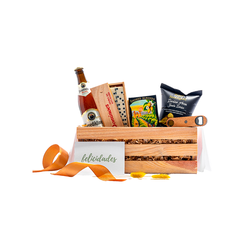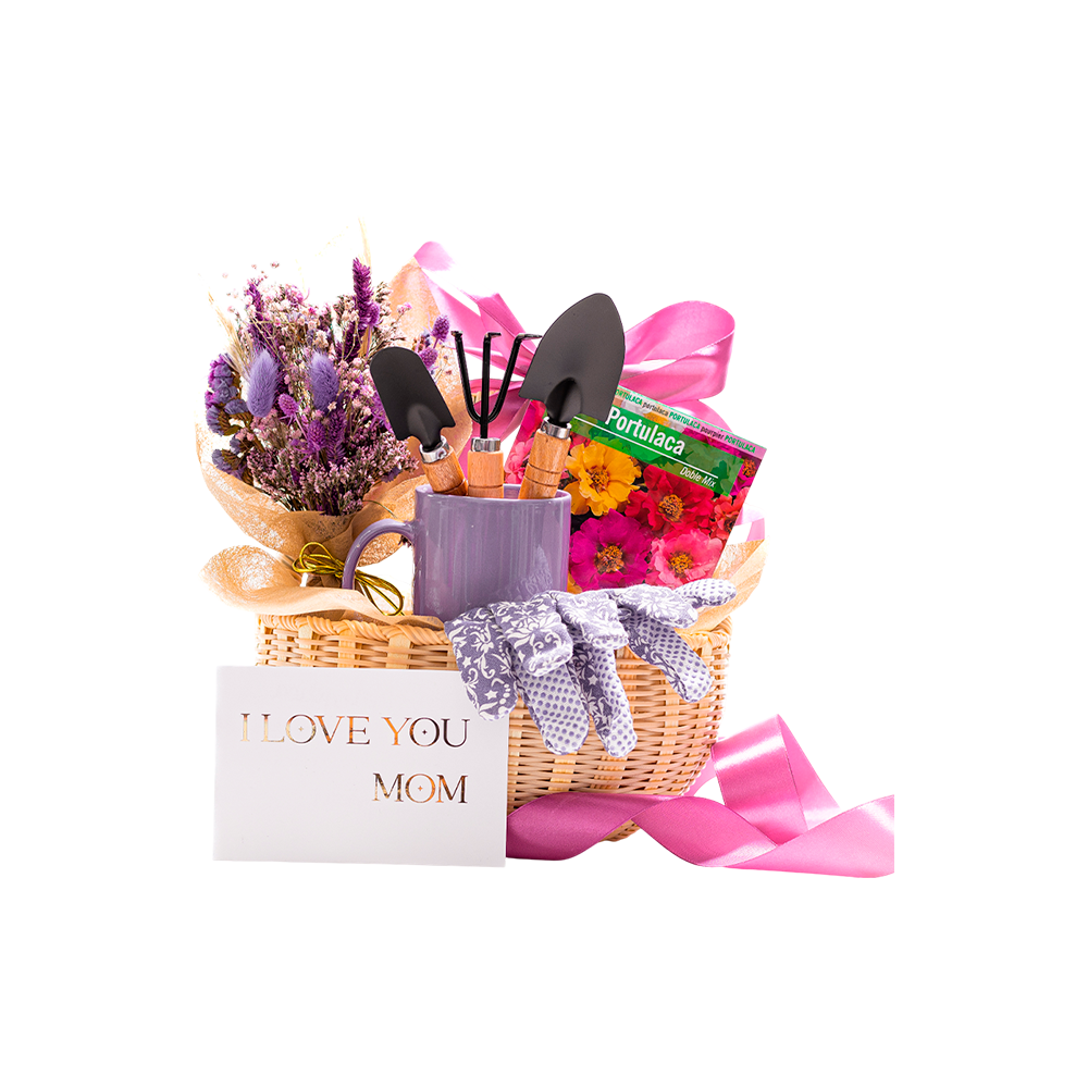 Empacado en canasta elaborada artesanalmente mediana en color beige. Papel de relleno, listón, tarjetas personalizables y flor natural seca.