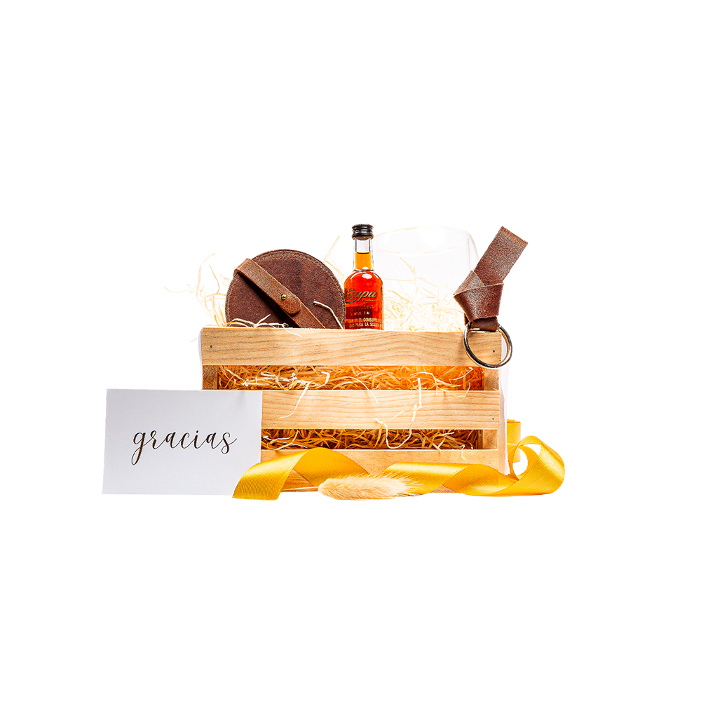 Empacado en caja de madera tipo cofre tamaño grande. Papel de relleno, listón, tarjetas personalizables y flor natural seca.