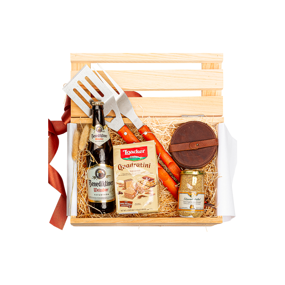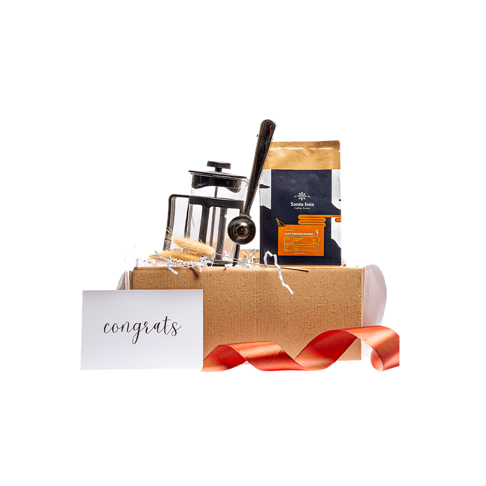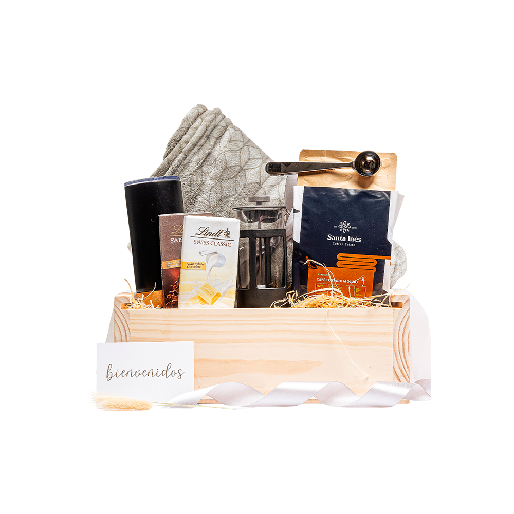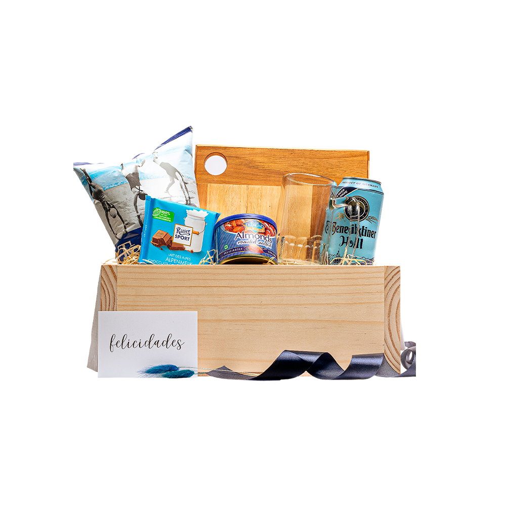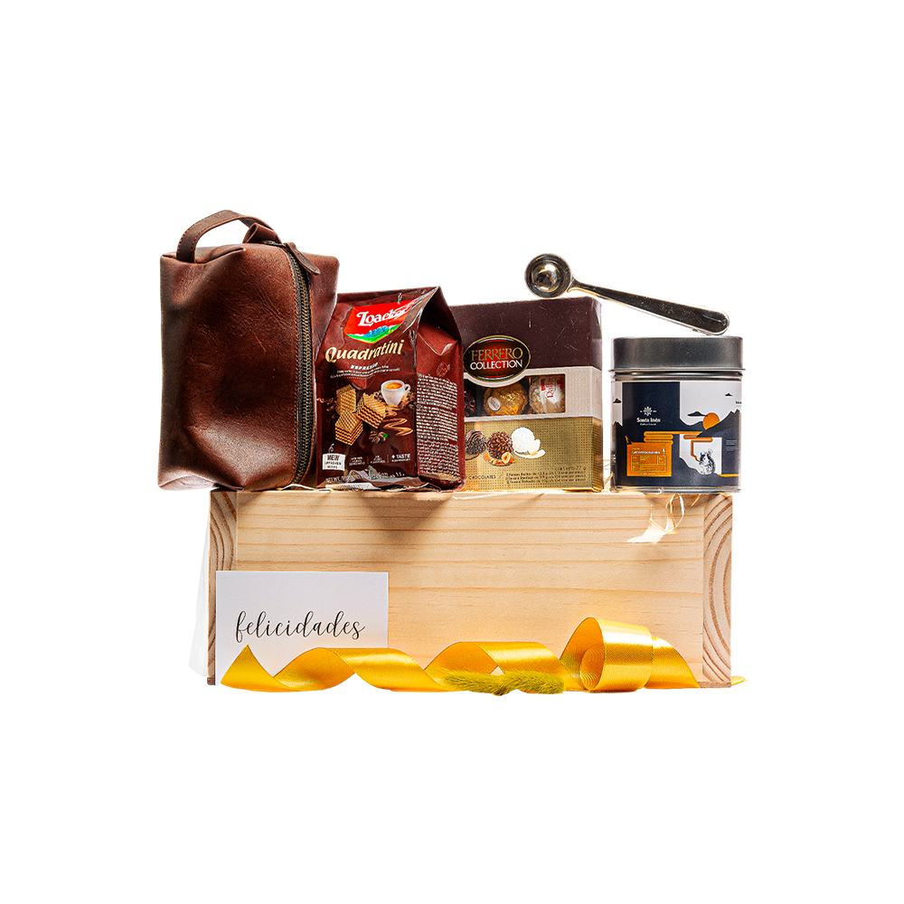 Empacado en caja de madera tipo cofre tamaño grande. Papel de relleno, listón, tarjetas personalizables y flor natural seca.