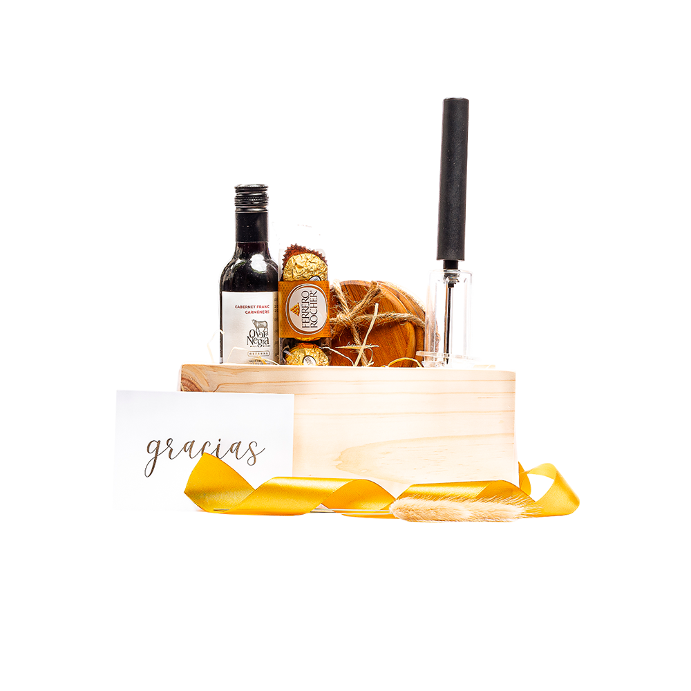 Empacado en canasta color rojo elaborada artesanalmente pequeña. Papel de relleno, listón, tarjetas personalizables y flor natural seca.