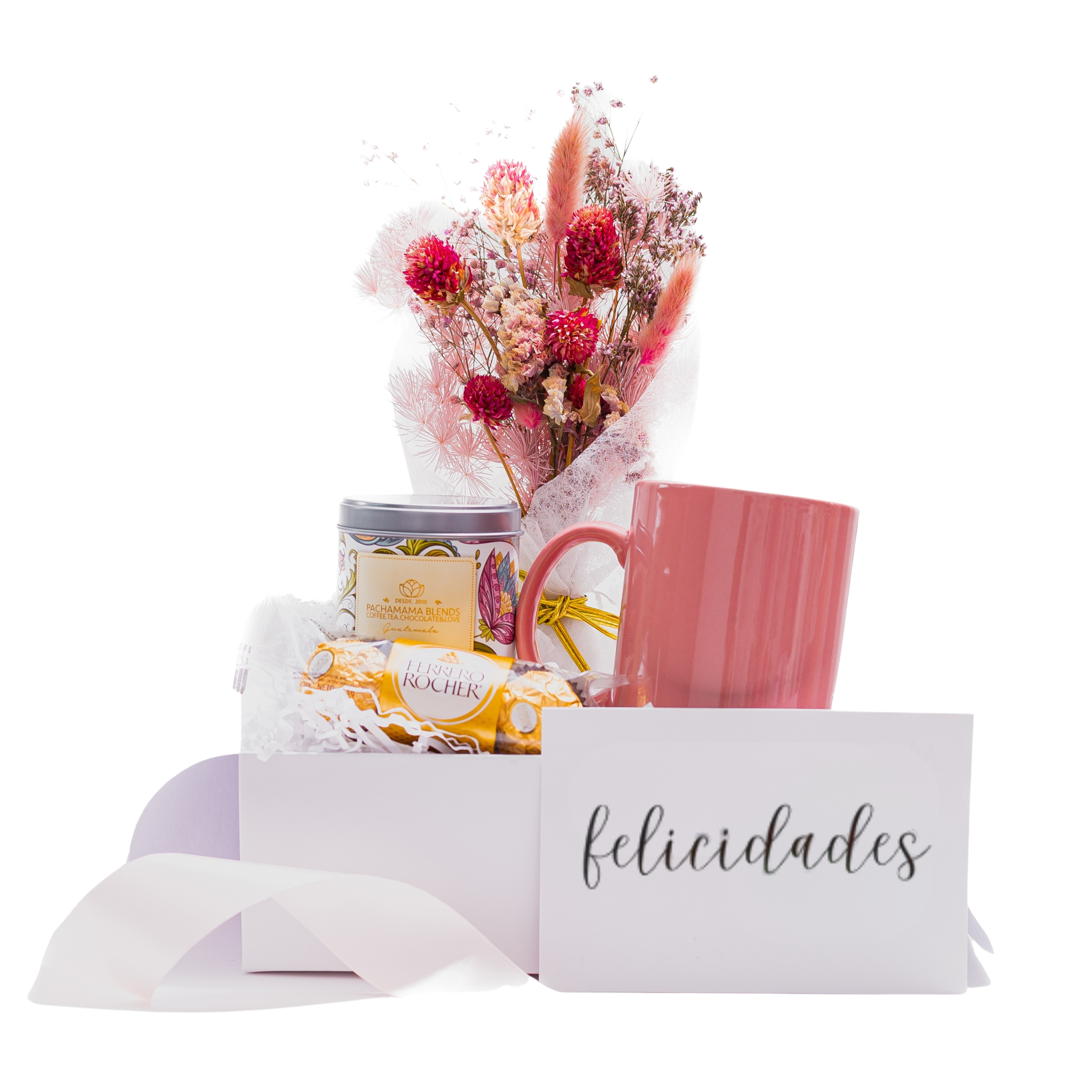 Empacado en caja cuadrada premium color blanco con cierre magnético pequeña. Papel de relleno, listón, tarjetas personalizables y flor natural seca.