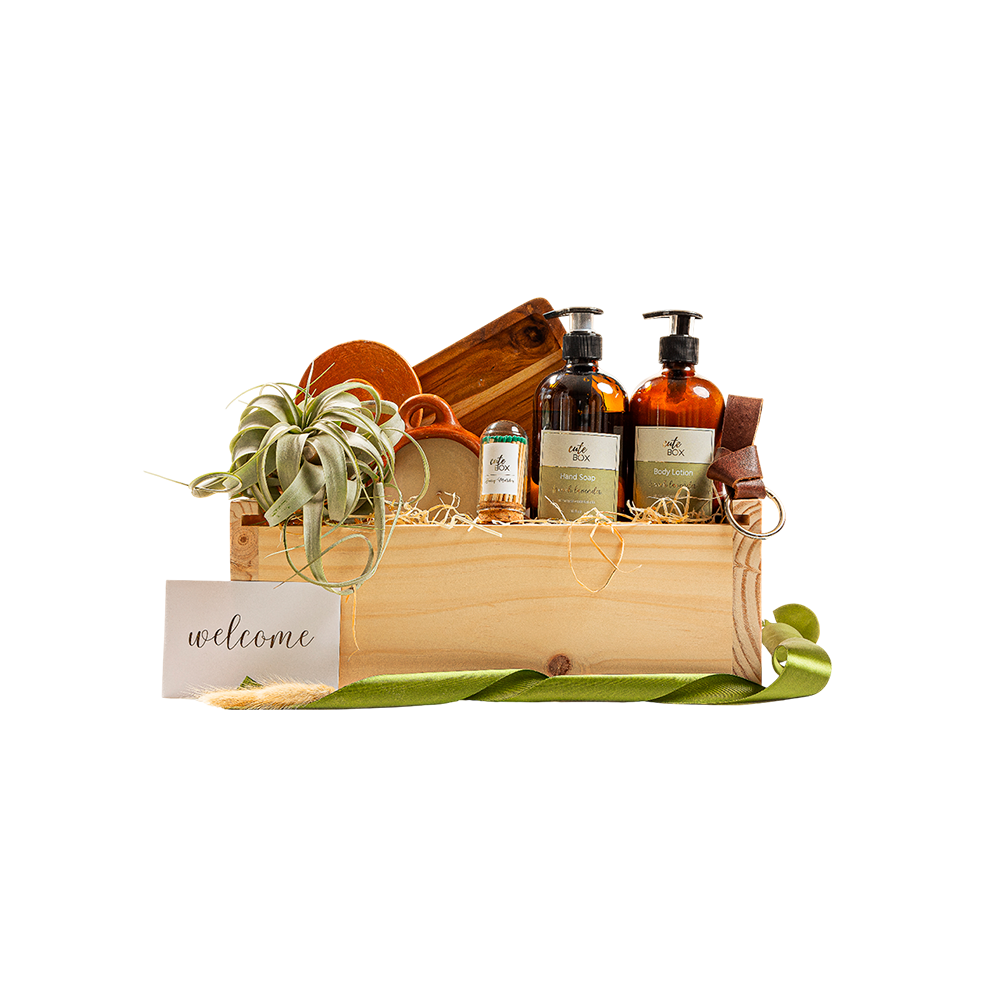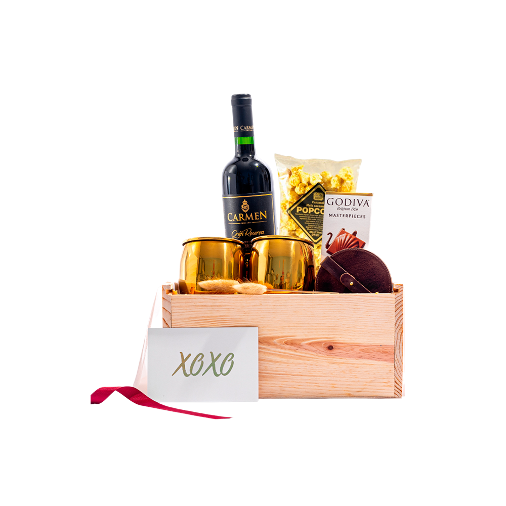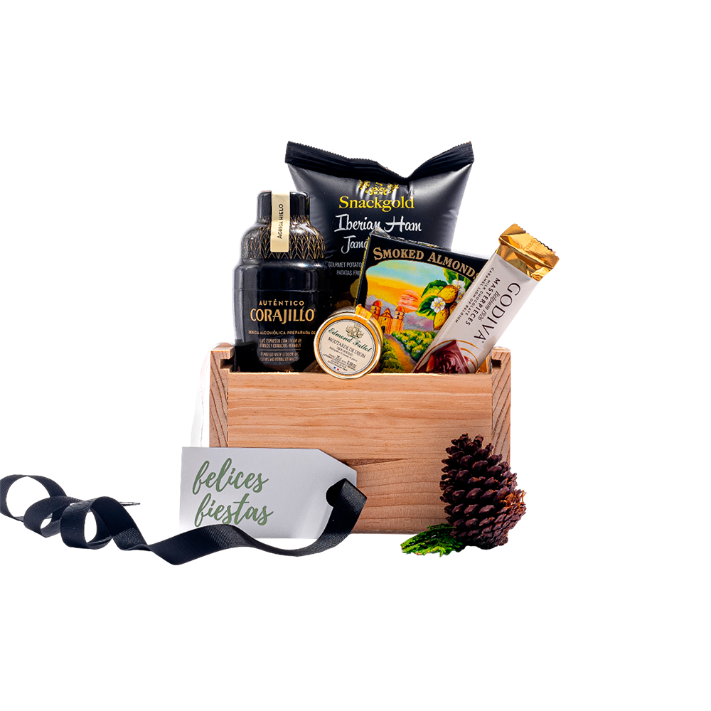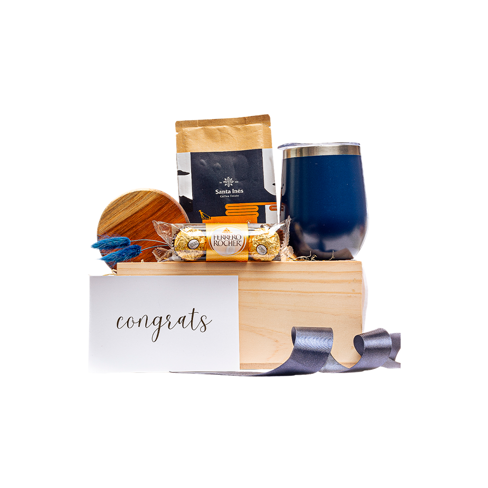 Empacado en caja de madera tipo cofre tamaño grande. Papel de relleno, listón, tarjetas personalizables y flor natural seca.