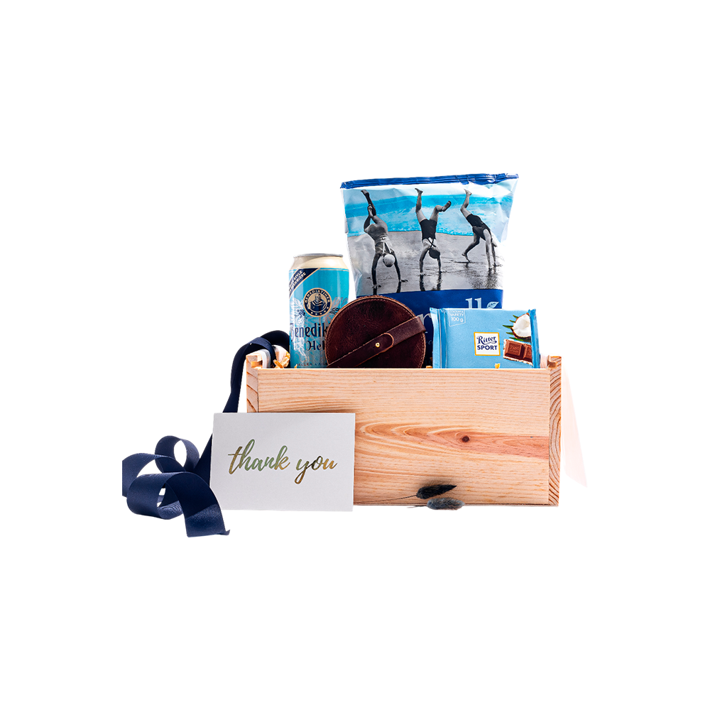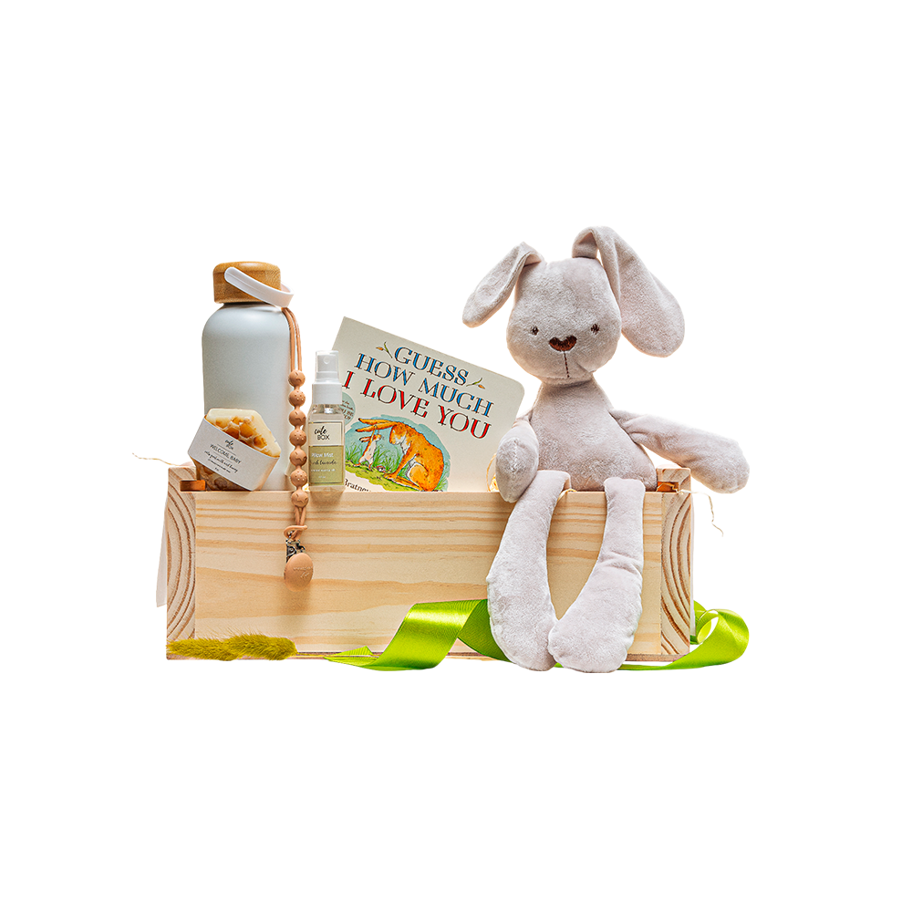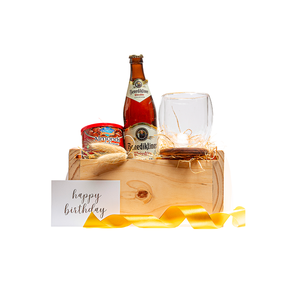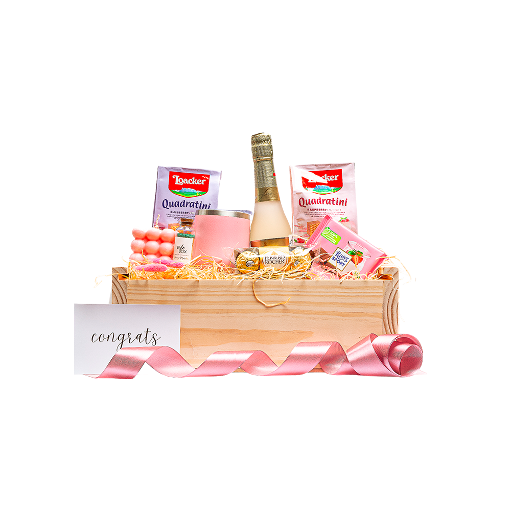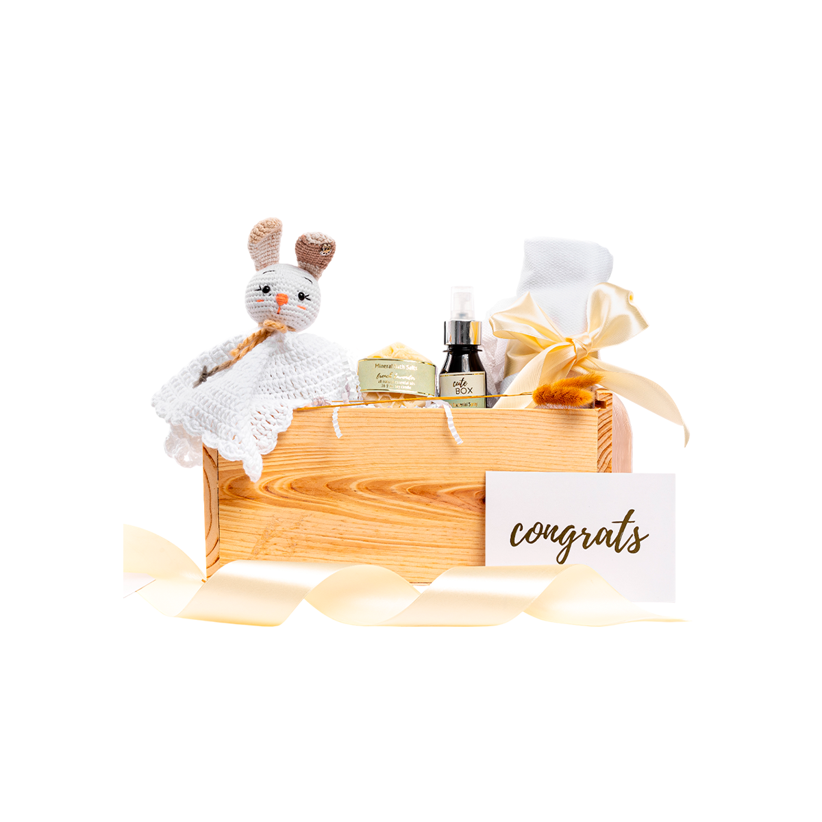 Empacado en caja de madera tipo cofre tamaño grande. Papel de relleno, listón, tarjetas personalizables y flor natural seca.
