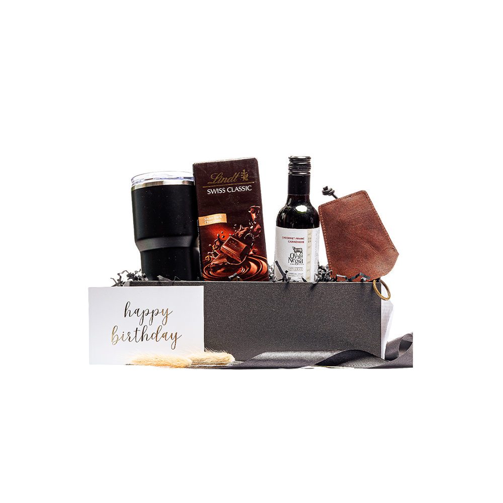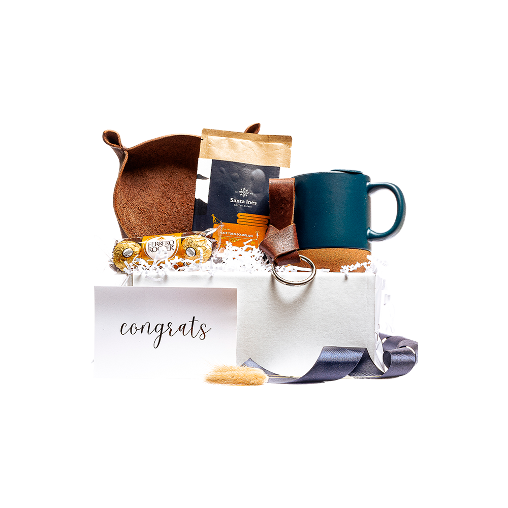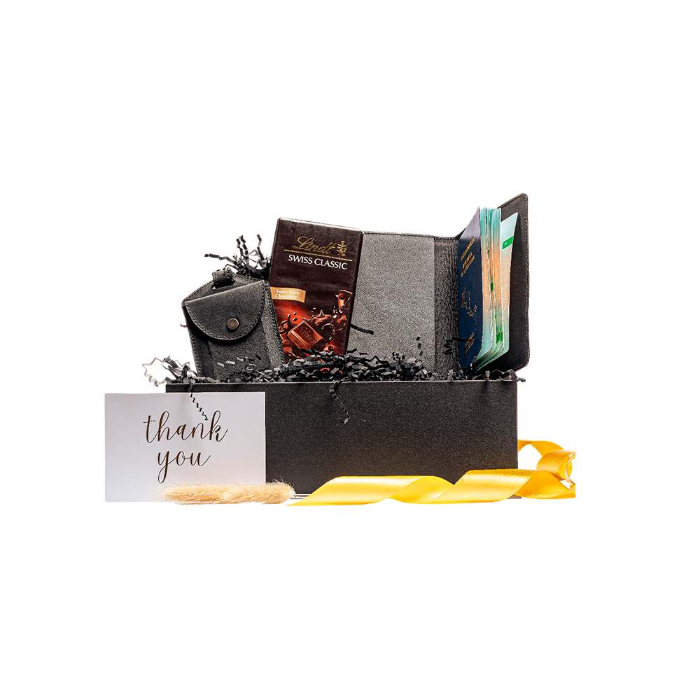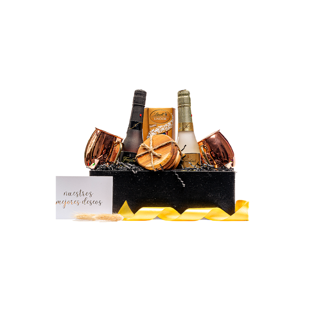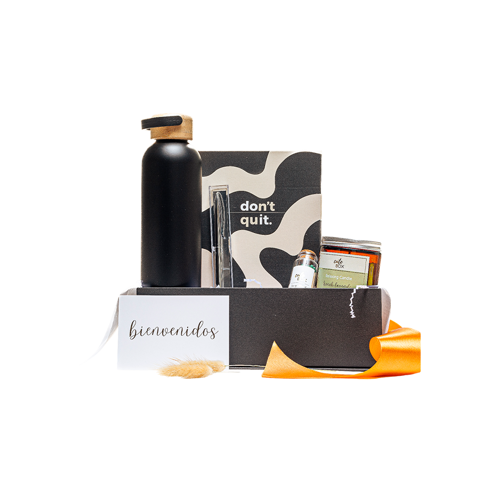 Empacado en caja premium con cierre magnético color negro mate mediana. Papel de relleno, listón, tarjetas personalizables y flor natural seca.