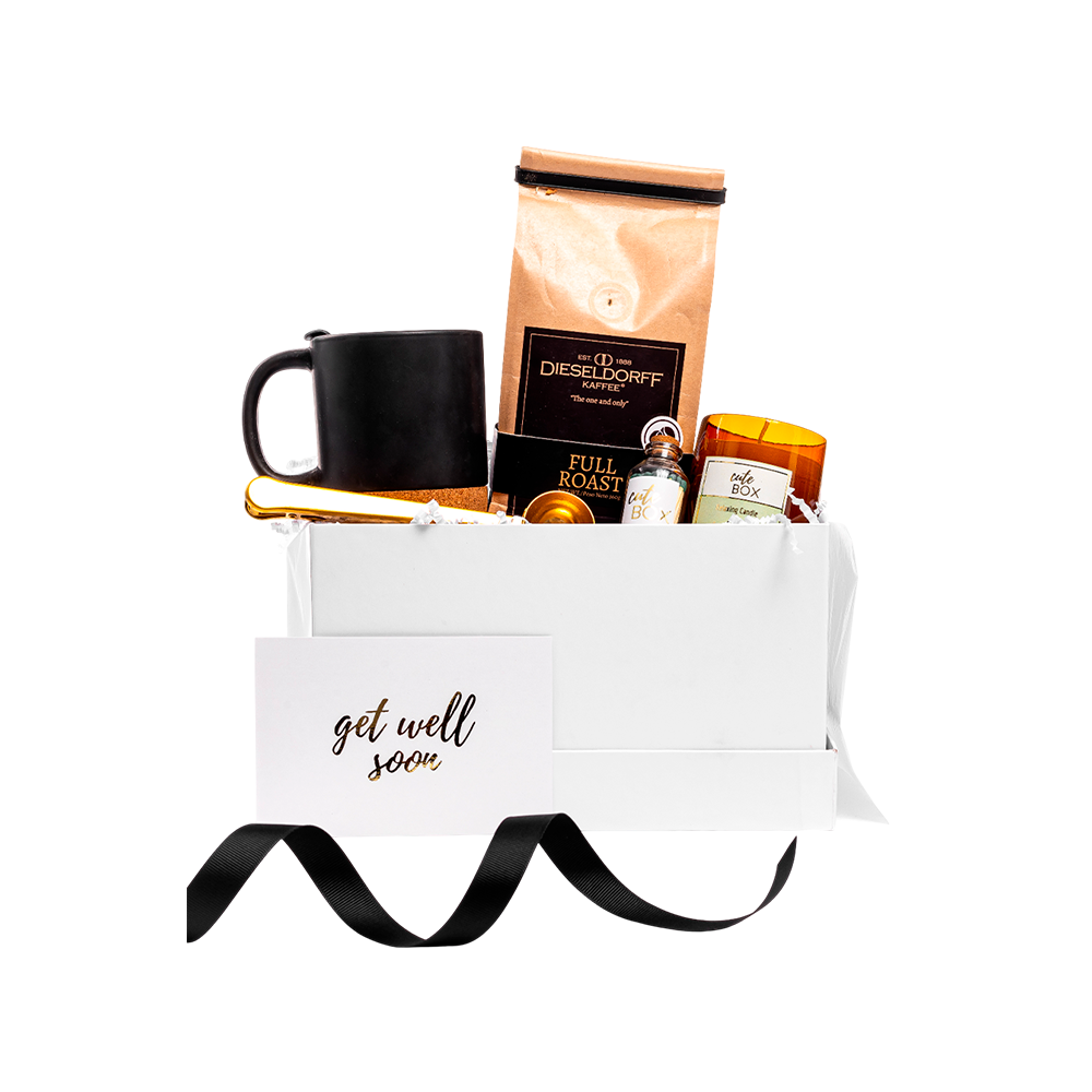 Empacado en caja premium con cierre magnético color negro mate grande. Papel de relleno, listón, tarjetas personalizables y flor natural seca.