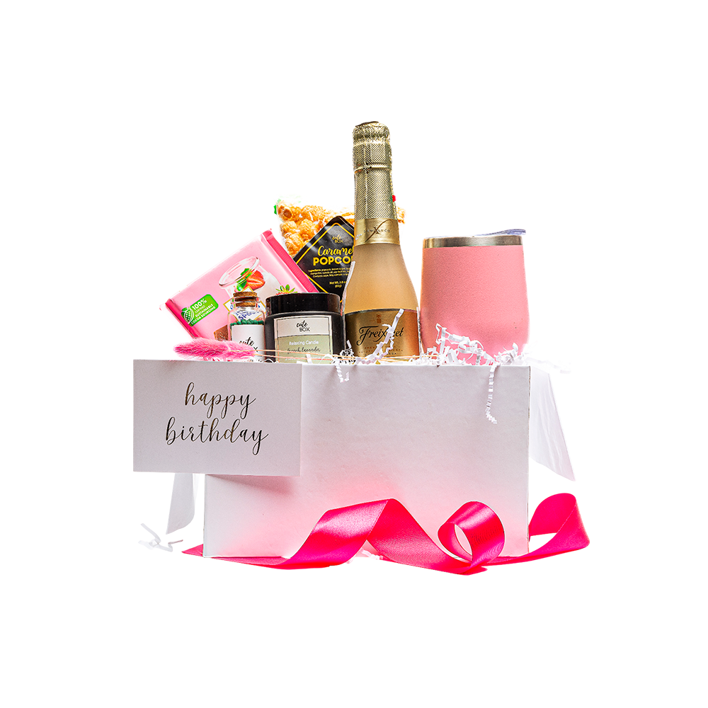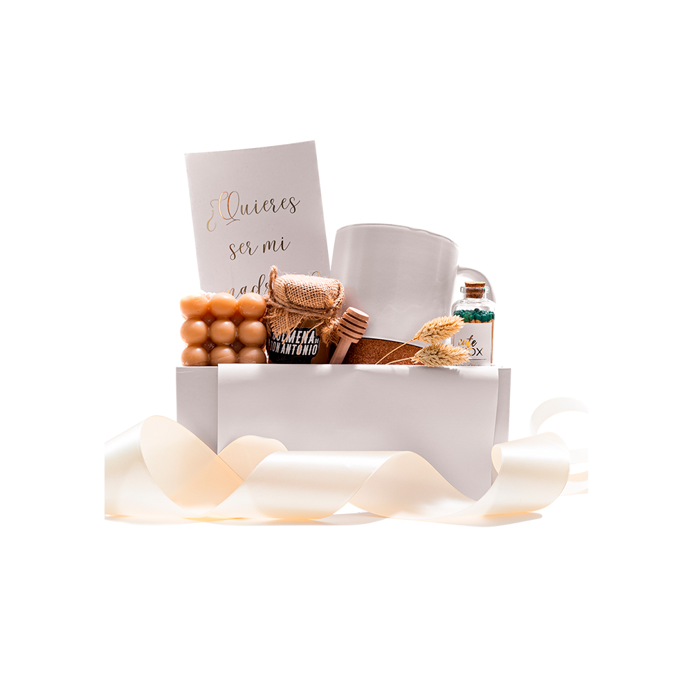Empacado en caja cuadrada premium color blanco con cierre magnético mediana. Papel de relleno, listón, tarjetas personalizables y flor natural seca.