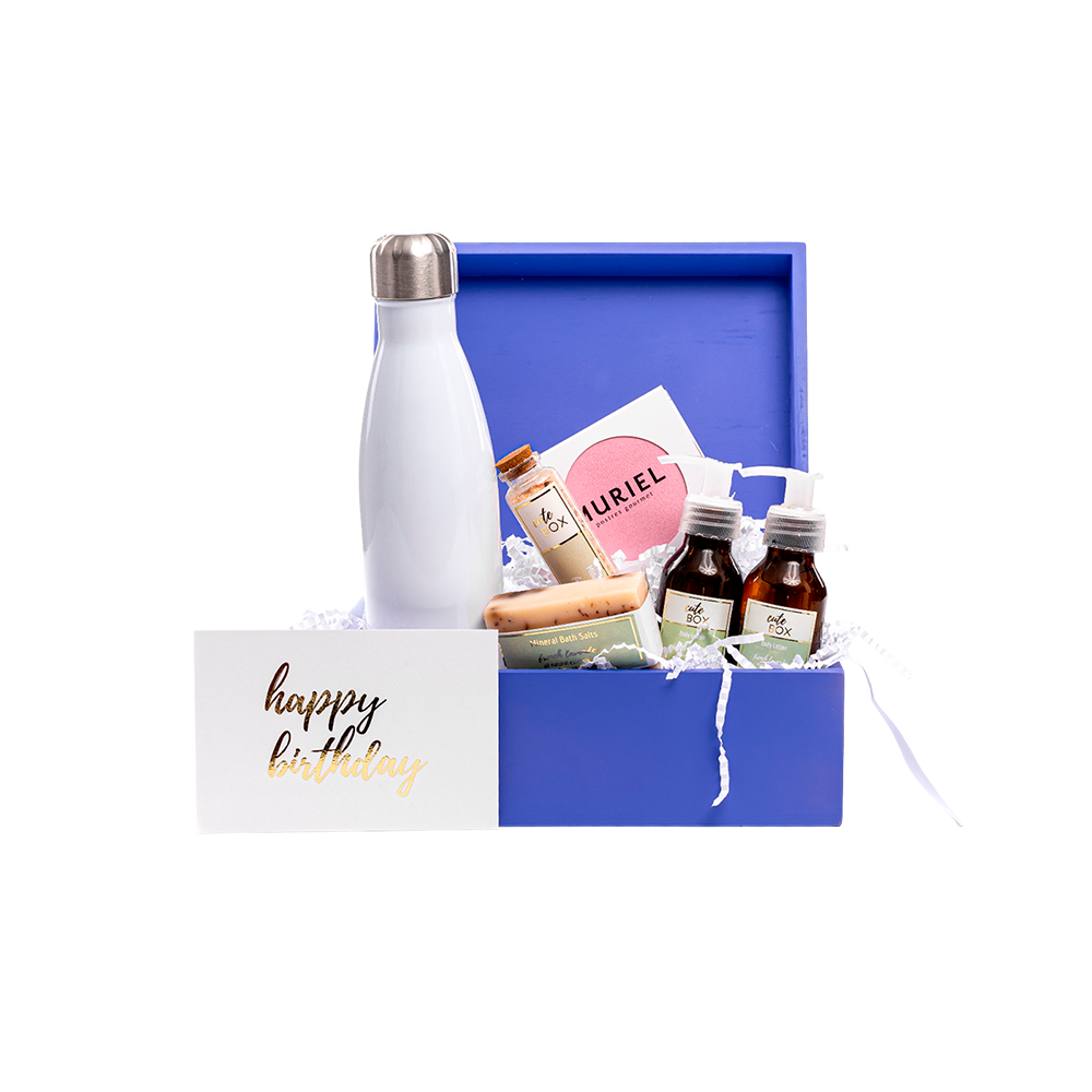 Empacado en caja de madera tipo cofre pintada en color lila mediana. Papel de relleno, listón, tarjetas personalizables y flor natural seca.