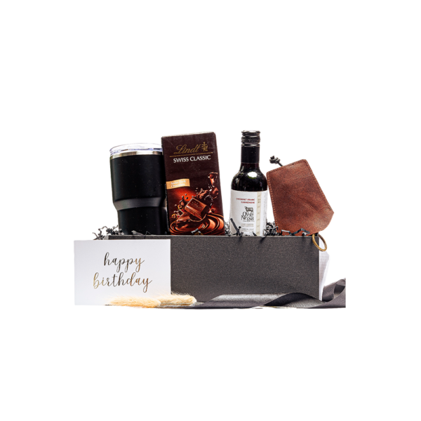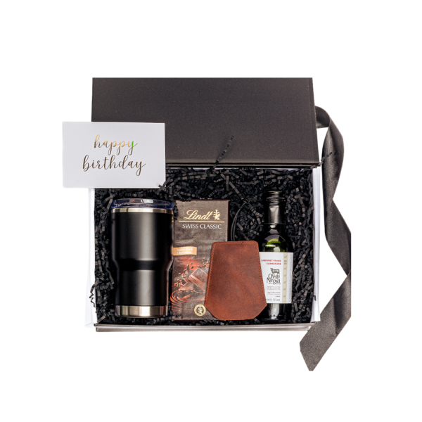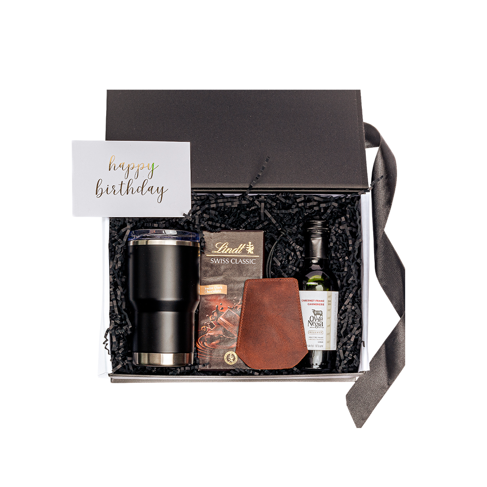 Empacado en caja premium con cierre magnético color negro mate mediana. Papel de relleno, listón, tarjetas personalizables y flor natural seca.