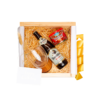 Empacado en caja de madera con tapa deslizable pequeña. Papel de relleno, listón, tarjetas personalizables y flor natural seca.