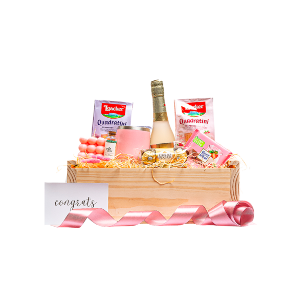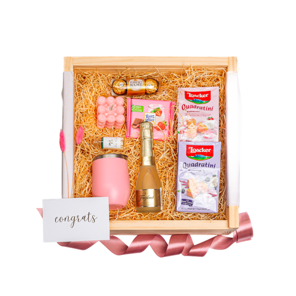 Empacado en caja de madera con tapa deslizable grande. Papel de relleno, listón, tarjetas personalizables y flor natural seca.