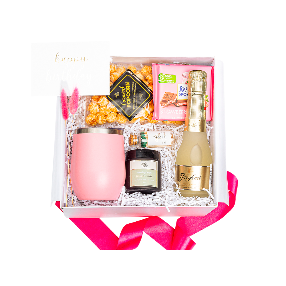 Empacado en caja cuadrada premium color blanco con cierre magnético mediana. Papel de relleno, listón, tarjetas personalizables y flor natural seca.