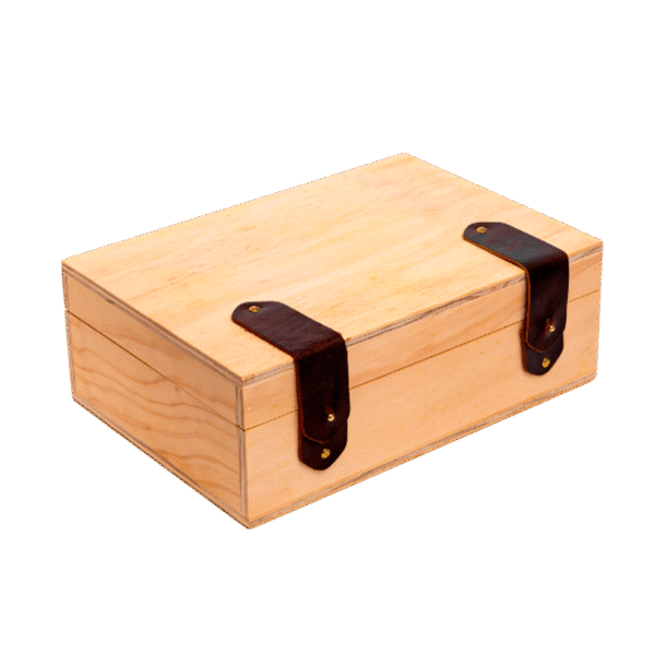 CAJA DE MADERA TIPO COFRE CON CIERRE DE CUERO