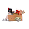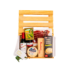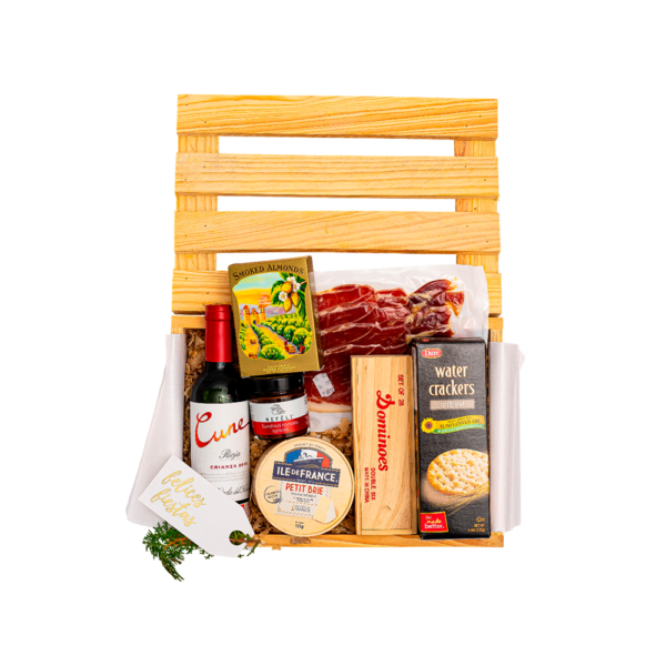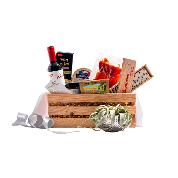 Empacado en caja de madera tipo cofre tamaño grande. Papel de relleno, listón, tarjetas personalizables y flor natural seca.