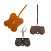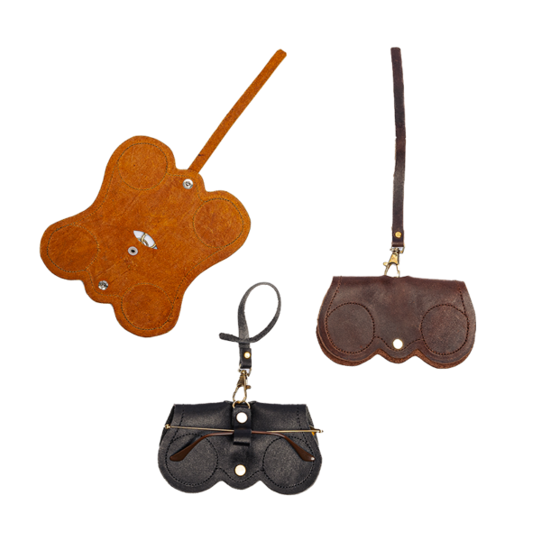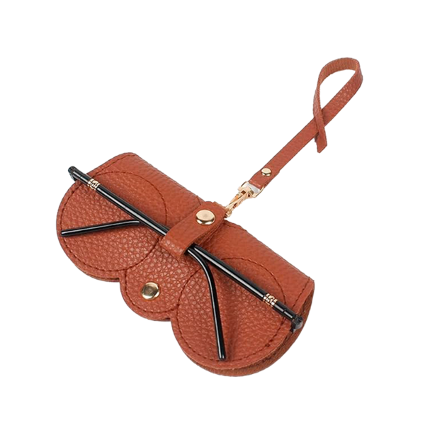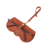 Estuche protector de lentes en cuero y accesorios para colgar en metal dorado.