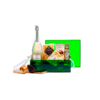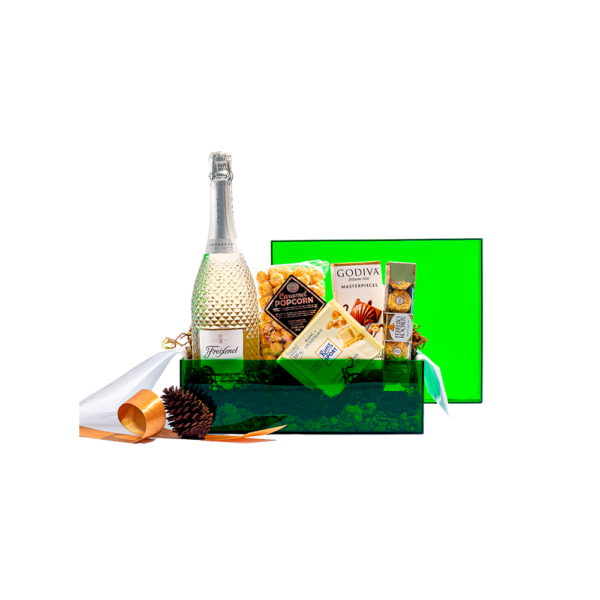 Empacado en caja rectangular de acrílico color verde grande. Papel de relleno, listón, tarjetas personalizables y flor natural seca.