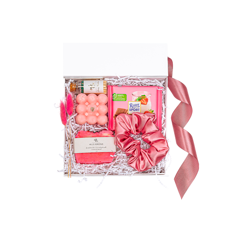 Empacado en caja rectangular premium color blanco con cierre magnético pequeña. Papel de relleno, listón, tarjetas personalizables y flor natural seca.