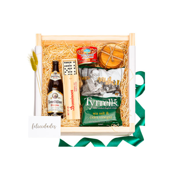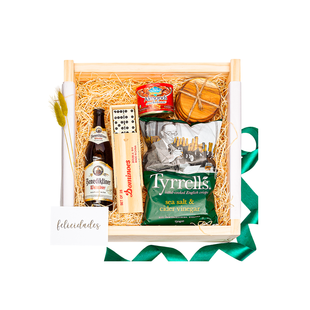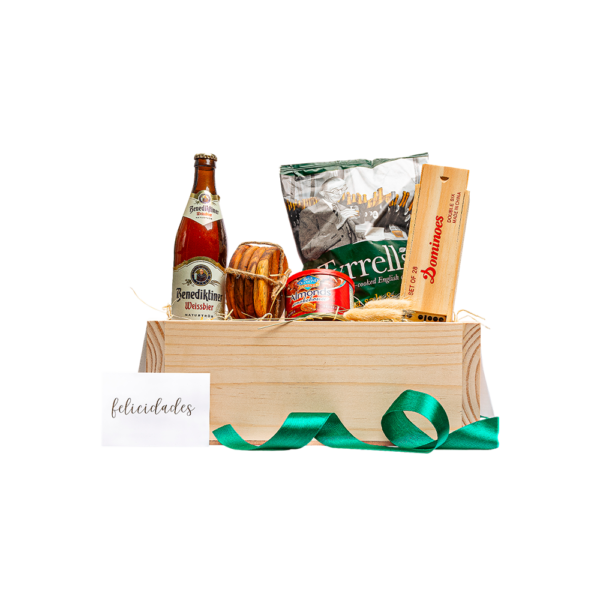 Empacado en caja de madera con tapa deslizable grande. Papel de relleno, listón, tarjetas personalizables y flor natural seca.