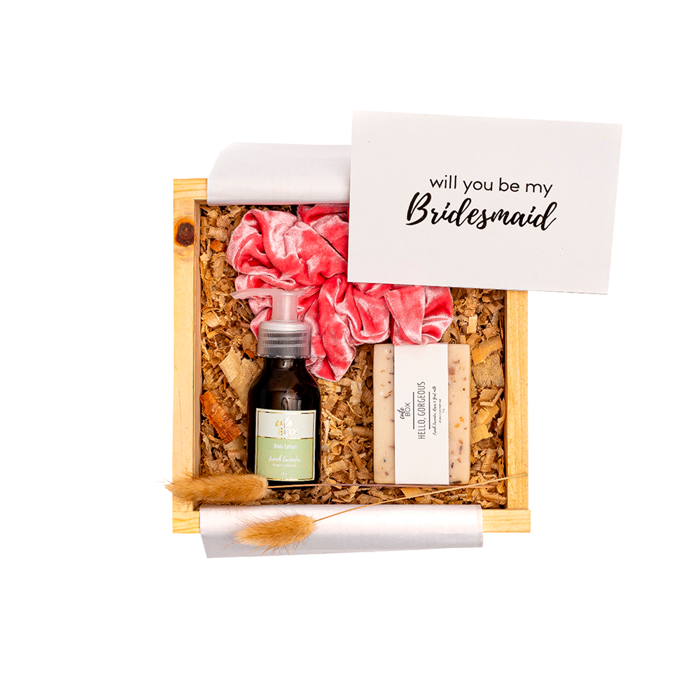 Empacado en caja de madera con tapa deslizable pequeña. Papel de relleno, listón, tarjetas personalizables y flor natural seca.