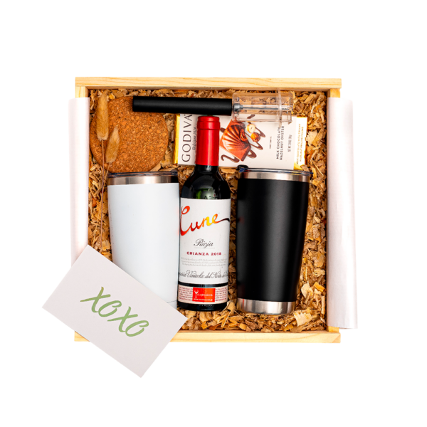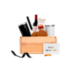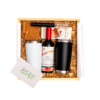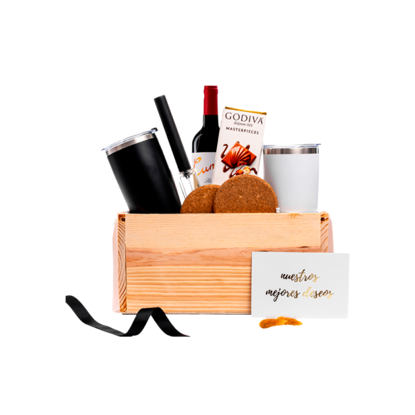 Empacado en caja de madera con tapa deslizable grande. Papel de relleno, listón, tarjetas personalizables y flor natural seca.