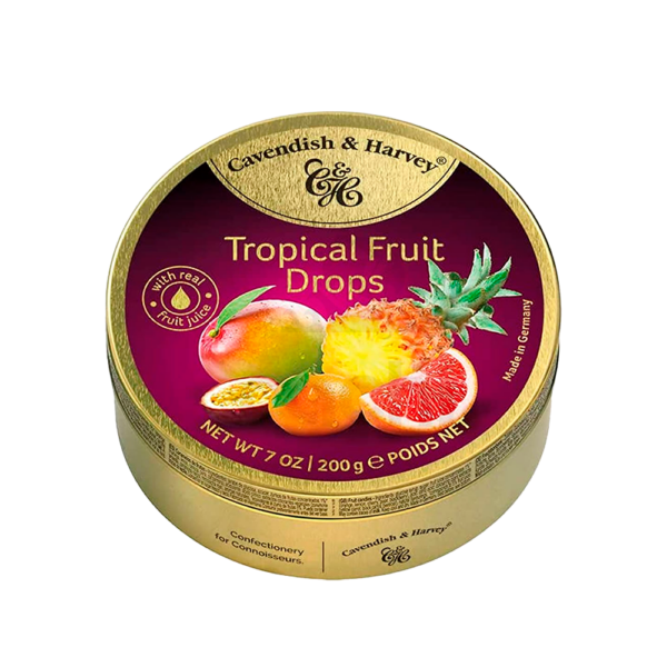 Lata de caramelos sabor frutas tropicales Cavendish & Harvey 200g.