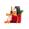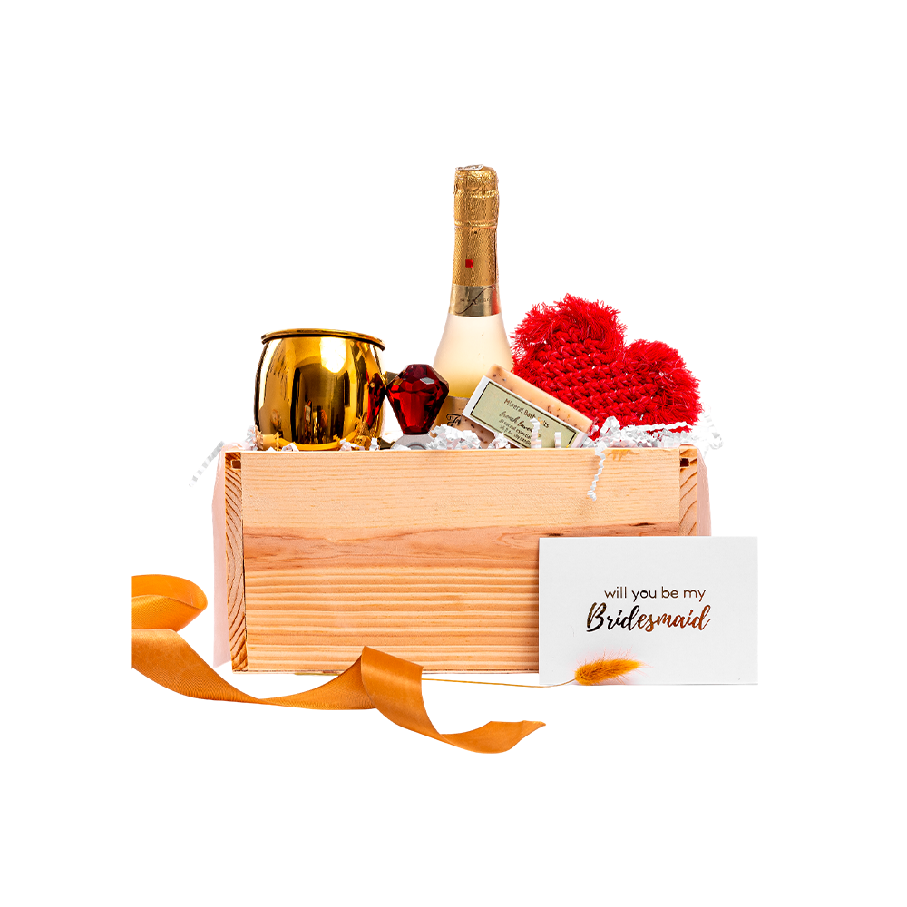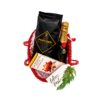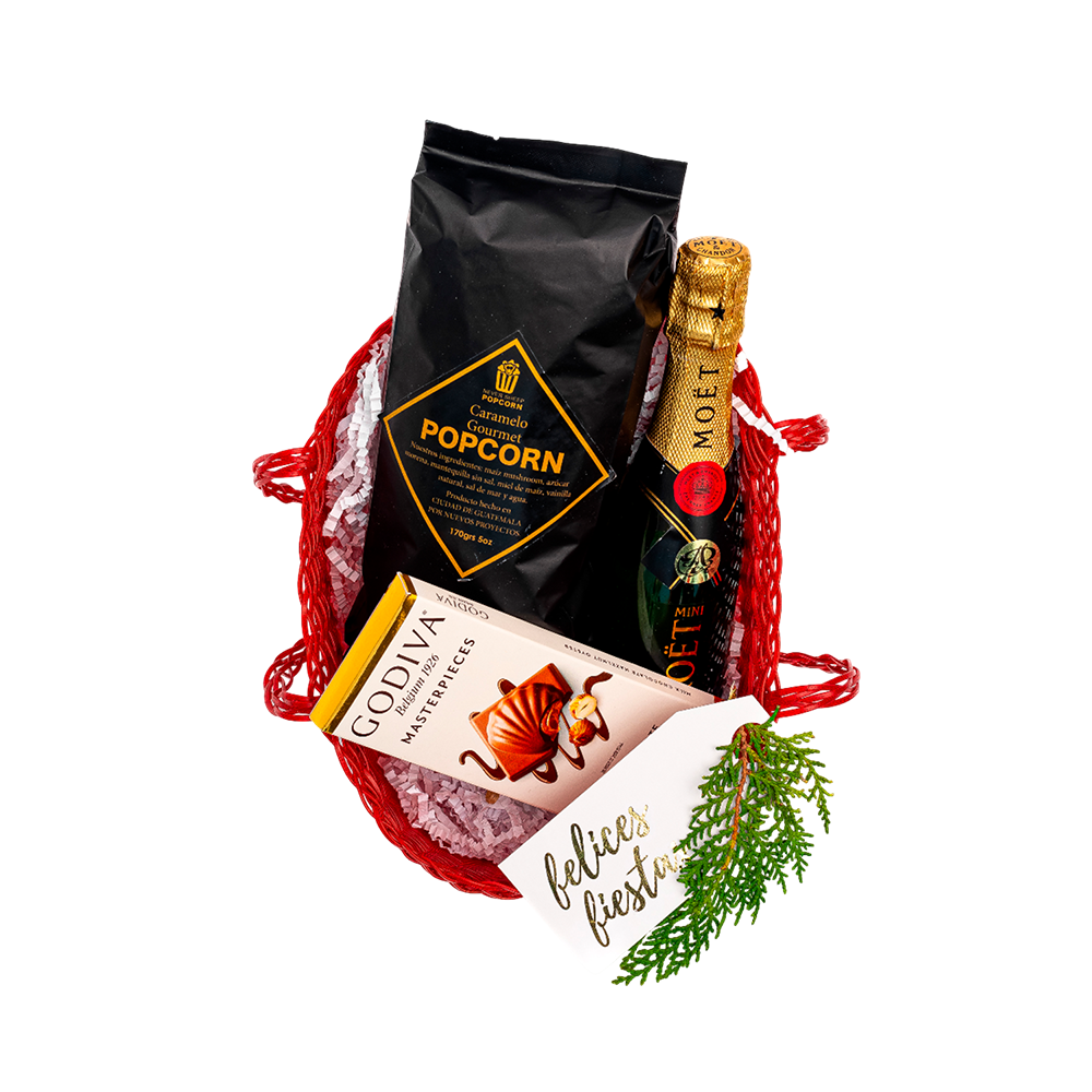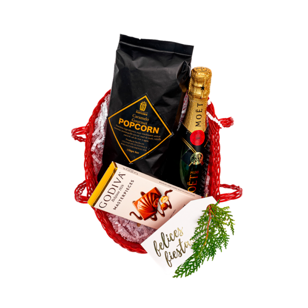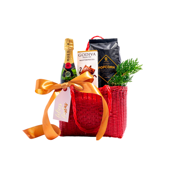 Empacado en canasta color rojo elaborada artesanalmente pequeña. Papel de relleno, listón, tarjetas personalizables y flor natural seca.