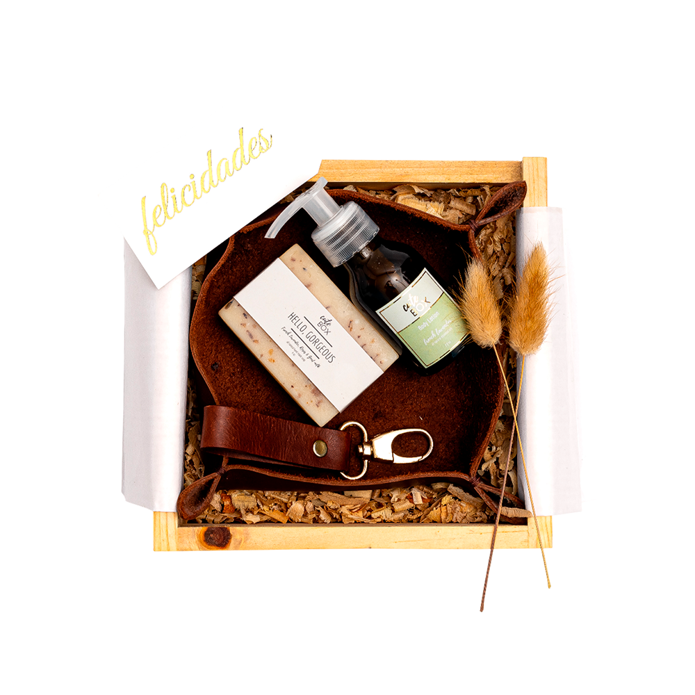 Empacado en caja de madera con tapa deslizable pequeña. Papel de relleno, listón, tarjetas personalizables y flor natural seca.