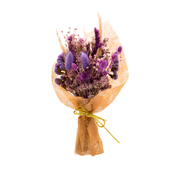 Está compuesto por una selección de flores naturales en tonos púrpura, ideal para regalar o decorar cualquier espacio con un toque de elegancia y frescura.