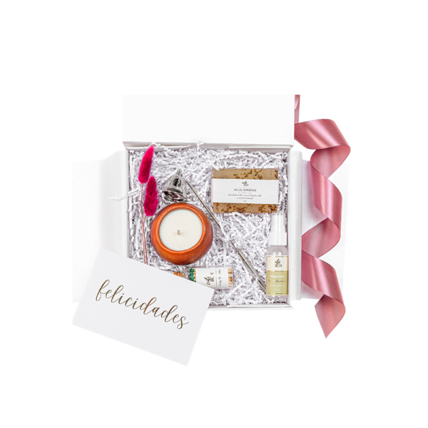Al agregar tu regalo, puedes seleccionar el color del listón de tela satinada, la flor natural preservada que más te guste, el diseño de la tarjeta con acabado soft touch y detalles en foil dorado, y además incluir un mensaje escrito a mano. Cada elección hace tu obsequio aún más personal y especial.