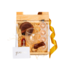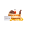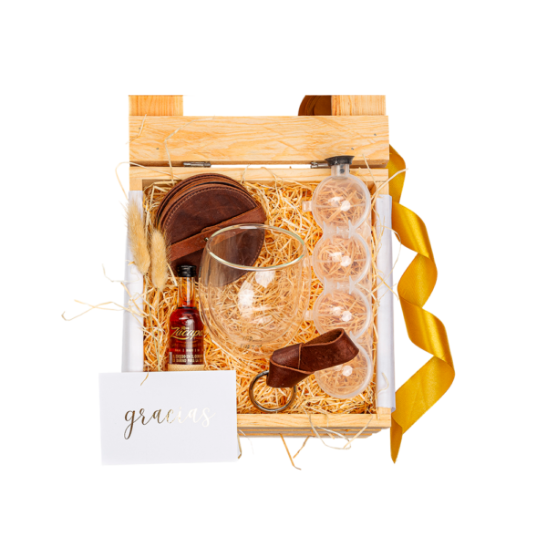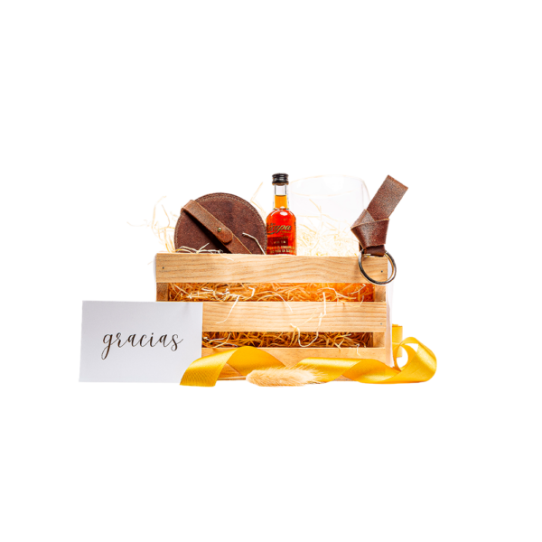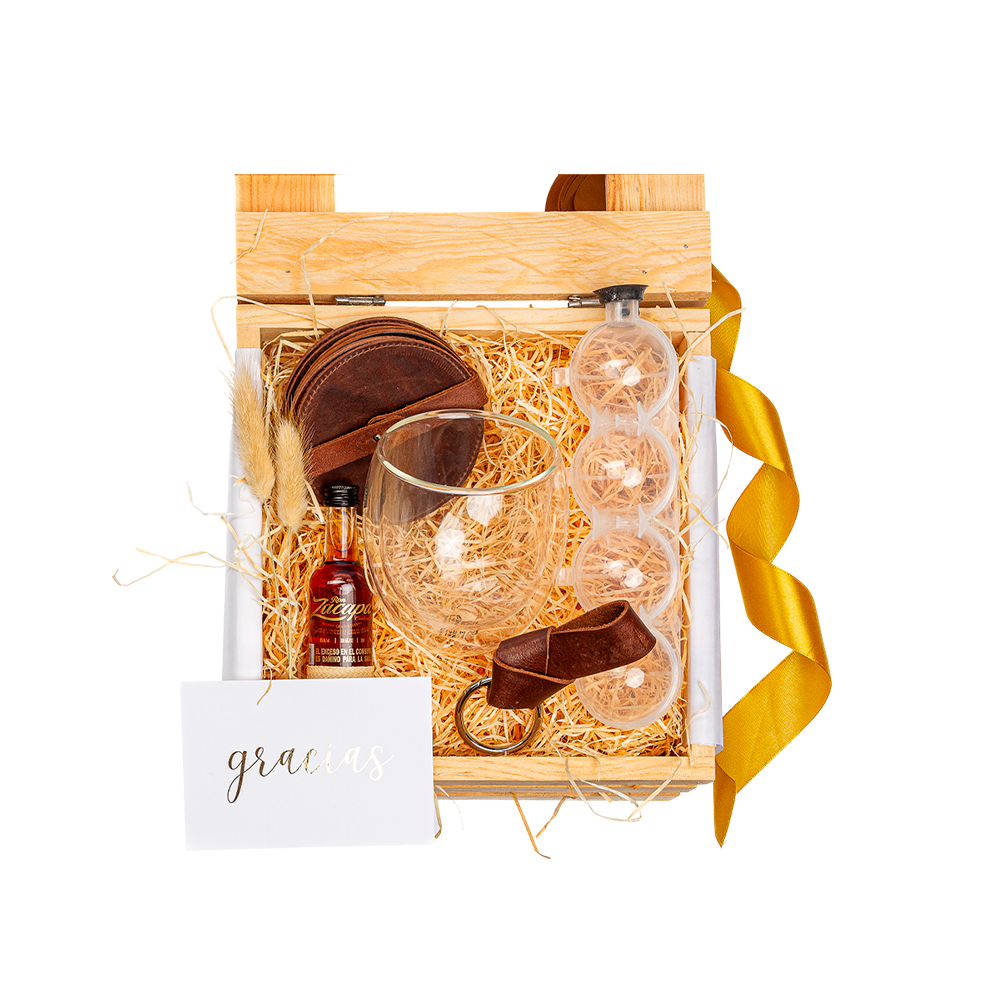 Empacado en caja de madera tipo cofre tamaño pequeño. Papel de relleno, listón, tarjetas personalizables y flor natural seca.