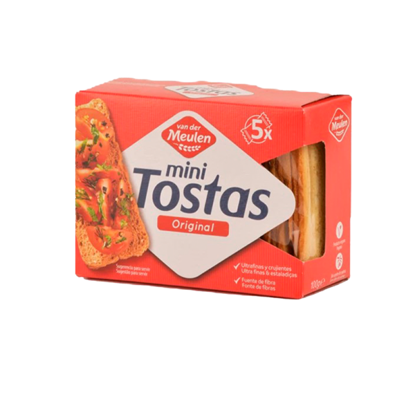 Las Mini Tostas Original Van Der Meulen 120g son pequeñas rebanadas de pan crujiente, perfectas para acompañar tus aperitivos, quesos, patés o guacamole.