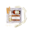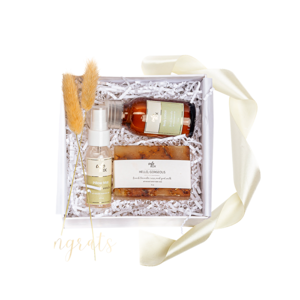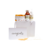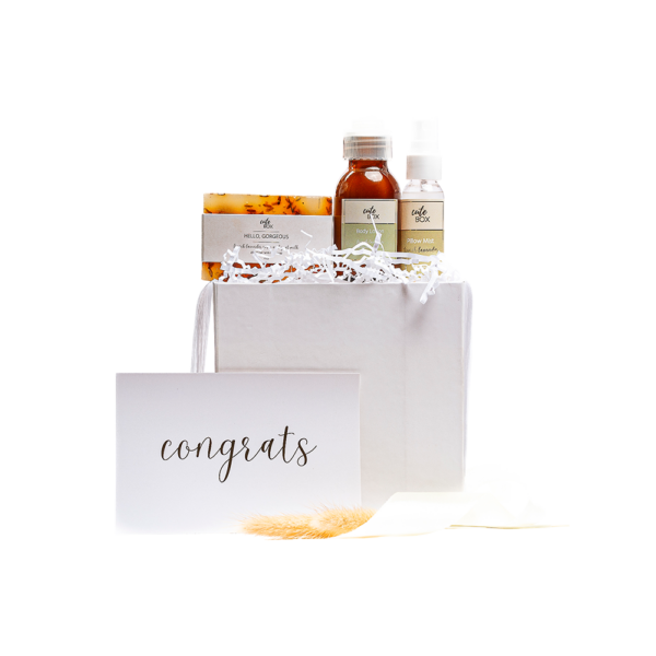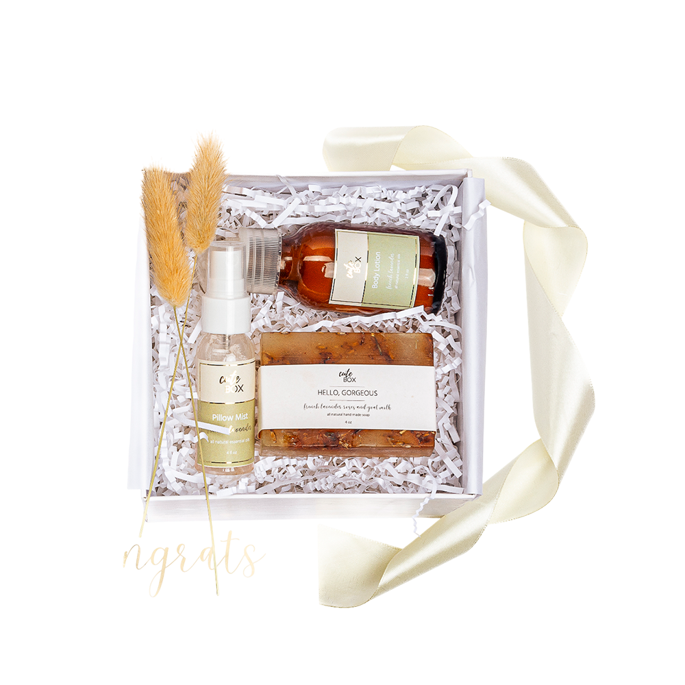 Empacado en caja cuadrada premium color blanco pequeña. Papel de relleno, listón, tarjetas personalizables y flor natural seca.