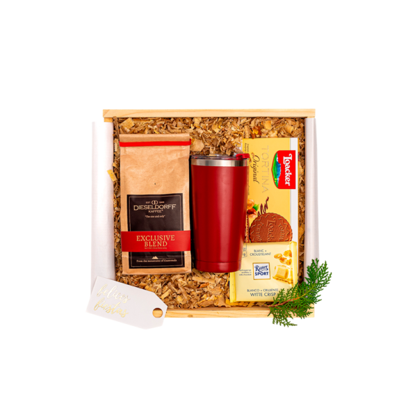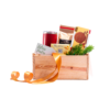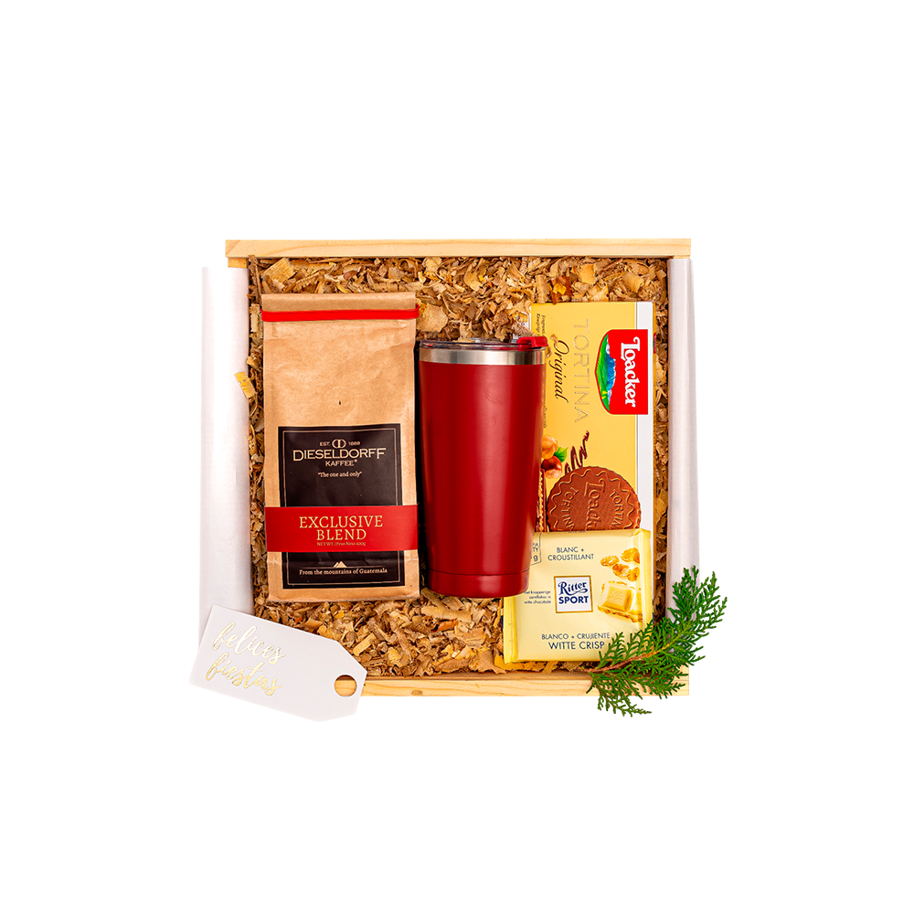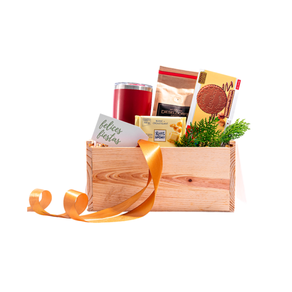 Empacado en caja de madera con tapa deslizable grande. Papel de relleno, listón, tarjetas personalizables y flor natural seca.