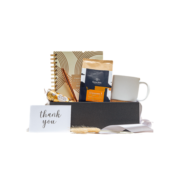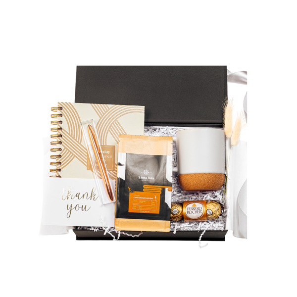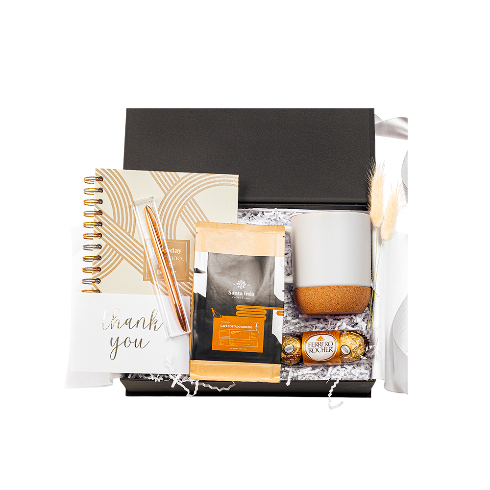 Empacado en caja premium con cierre magnético color negro mate grande. Papel de relleno, listón, tarjetas personalizables y flor natural seca.